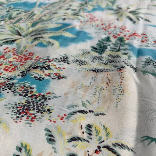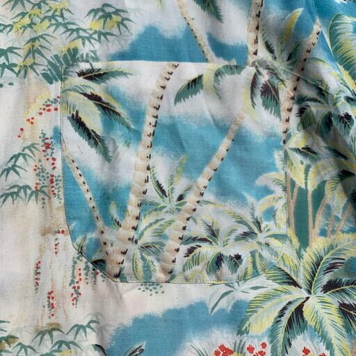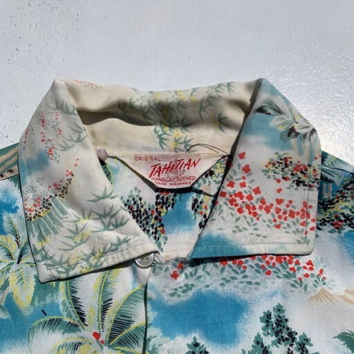 60年代頃のTAHITIANオープンカラーシャツです。開襟タイプで襟裏には芯が入っていた形跡がございます。ハンドスクリーンで南国のパームツリーやその他の樹木などがプリントされています。非常に細かいピッチで縫製されています。襟に薄汚れ、ボディにも柄物で目ダッチに食いですが、シミ汚れが見られます。襟芯を抜いた部分はステッチが解かれています。清算国は日本。Lサイズですが着丈は底まで長くないので程よいゆったり感で着ていただけます。このTAHITIANというメーカーのアイテムは物によっては高額なアイテムも存在しますので、是非興味のある方はいかがでしょうか。