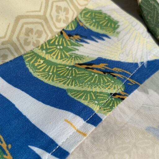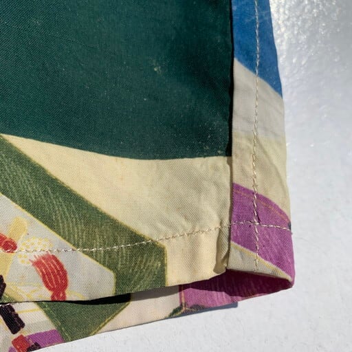 40年代頃の長袖和柄アロハシャツです。左右に大きく開いた袋縫いのロングポイント、古いシェルボタンを使用しており、襟元内側には別の着物生地が使用されています。鶴や打出の小槌、矢車など魔よけや縁起に良い図柄が入ります。タグが無い為メーカーは不明です。素材はシルクと思われます。第一ボタン付け根に少し生地の裂けがあり、所々に小さなシミが見られますが、特筆するダメージは無くミントコンディションと呼べる代物です。サイズはLサイズ相当。大きすぎないグッドサイズです。和柄の長袖アロハは大変希少ですので、コレクションに是非いかがでしょうか。