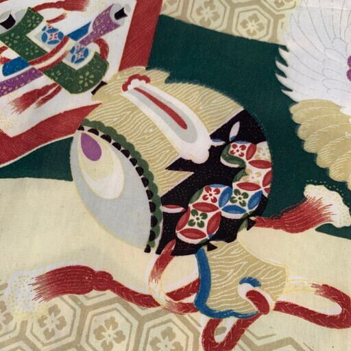40's UNKNOWN 和柄アロハシャツ 長袖 鶴 矢車 打出の小槌 着物 シェルボタン シルク ミントコンディション Lサイズ相当 希少 ヴィンテージ BA-994 RM1363H