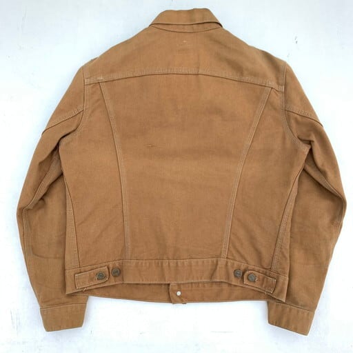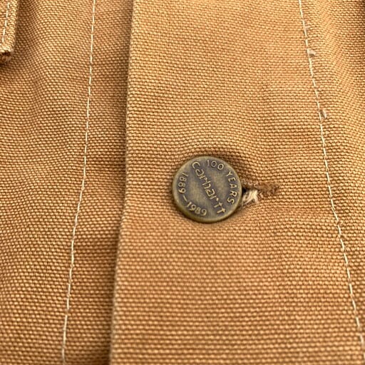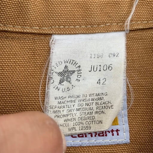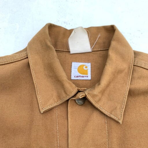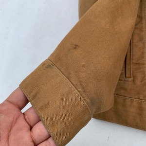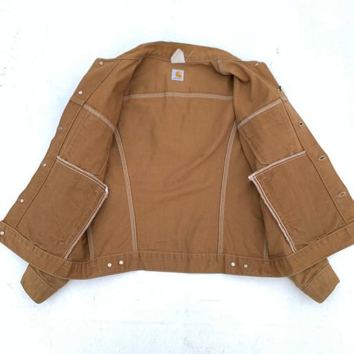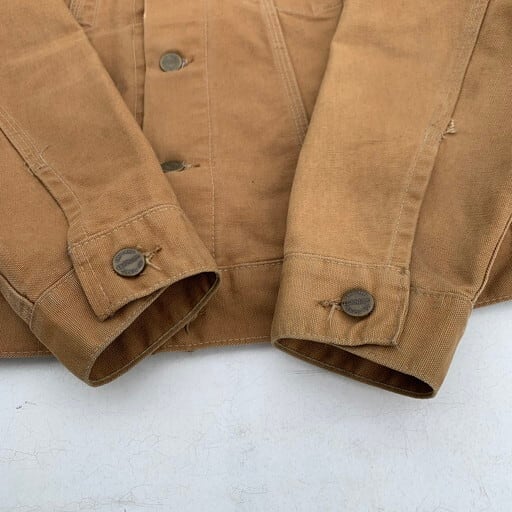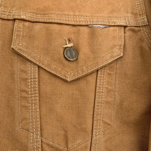 80年代頃のcarharttダックトラッカージャケットです。リーバイスでいう70506のポケット付きタイプです。首タグにはCRAFTED WITH ORIDE IN USAの星タグが付きます。ミシガンコートやデトロイトジャケットに比べ玉数が少ないアイテムだと思います。薄汚れはございますが、ダメージは特にございません。胸元ついていたタグは切り取られています。肩や袖にうっすらとヤケがございます。サイズは42と良いサイズ感です。Gジャンとは違うワーク感あふれる男らしい1着です。中にシャンブレーシャツなど合わせてみてはいかがでしょうか。