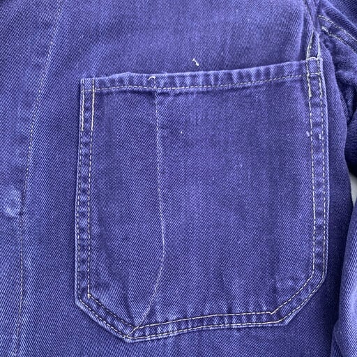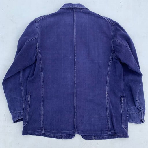 40年代から50年代頃のBOLENIUMブリティッシュコットンドリルワークジャケットです。ナス紺のように良い塩梅にフェードしており、雰囲気抜群のジャケットです。フロントは社名が浮き彫りされたチェンジボタンが3つ付きます。袖口やボディの所々にピンホールやダメージがございます。フランスやドイツのワークジャケットに比べ玉数も少ないのではないでしょうか。3つボタンなので、カバーオールとテーラードの間のようで、ワーク物ですが、綺麗目なコーディネートにも合わせていただけます。色合いがとても素敵でお勧めです。