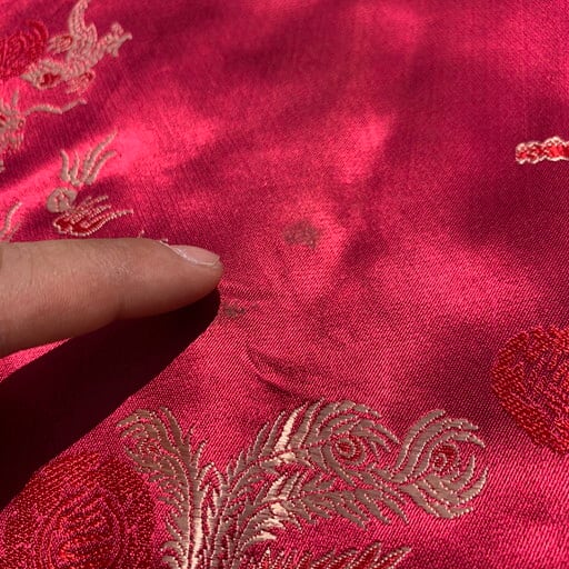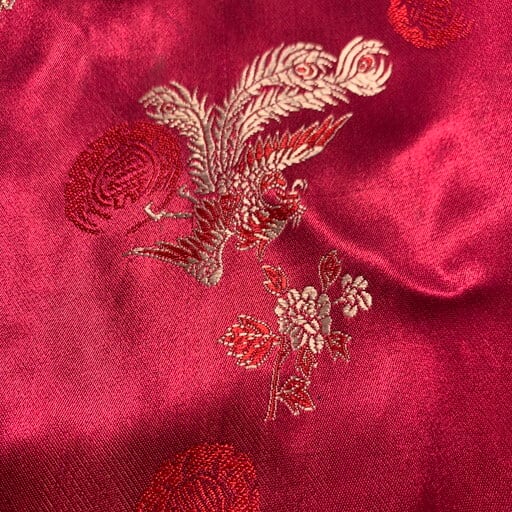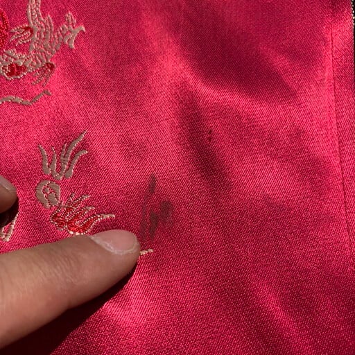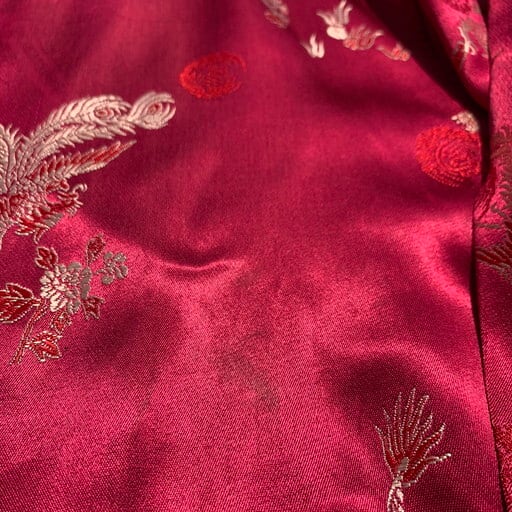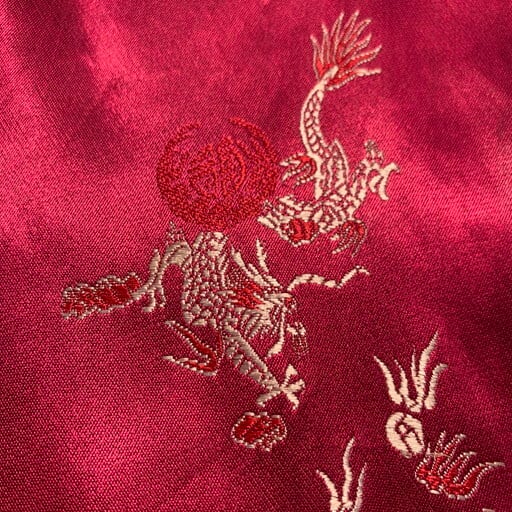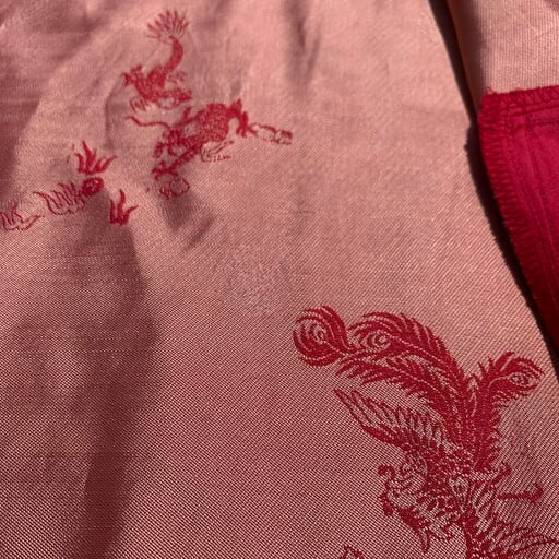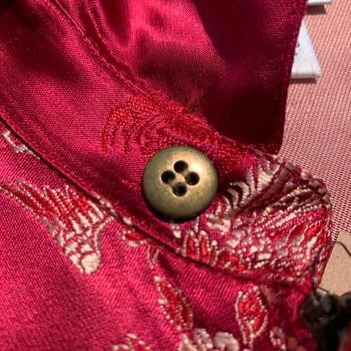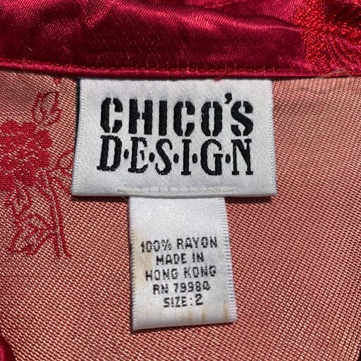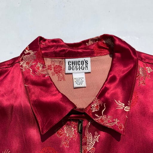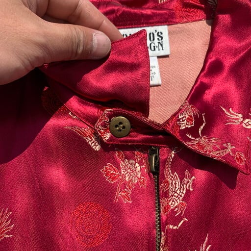 80年代頃のCHICO'S DESIGNレーヨンチャイナジャケットです。チンストラップの付いたスウィングトップタイプのジャケットで、龍や鳳凰、喜を二つ並べた双喜紋や福など目出度い図柄が施されています。ボタンはゴールドのメタルボタンが使われています。所々に色抜けや小さな汚れが見られます。こちらのブランドはシャツタイプが多いですが、このスウィングトップタイプは数も少なく珍しいと思います。ベトジャンのようなスーベニアジャケットのような感覚で羽織れるアイテムです。デザインの良さに加えサイズもL相当ですので、かなりおすすめな1着です。