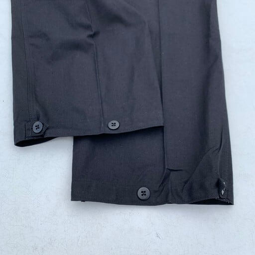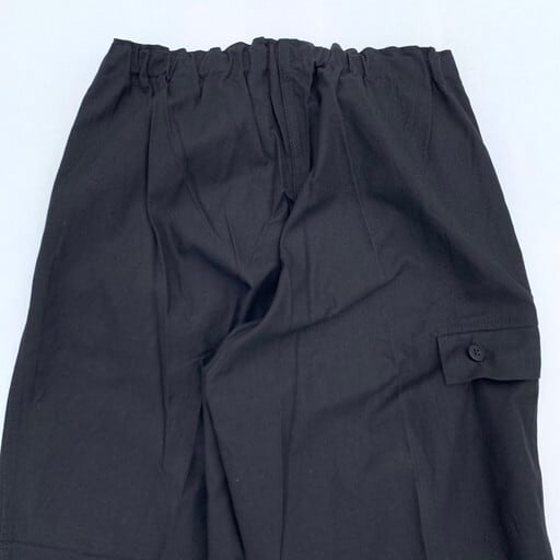 60年代から70年代頃の物と思われるNVAコットンオーバーパンツです。1956年に創設されたNVA(東ドイツ人民軍)は1989年11月9日に旅行及び国外移住の大幅な規制緩和の政令が発令された翌11月10日にベルリンの壁が崩壊(撤去)し、1990年10月に東西ドイツ統一と共に解散となった部隊です。リネン混のようなブラックのコットン生地で、作業などを行う際に着用されていたオーバーパンツです。ウエスト半分がゴムで伸縮しますので、2~3インチ程伸びます。右ポケットは貫通式で、ベルトループは付属しません。内側にサスペンダー用のD管が付いています。擦れなど殆ど無い美品です。シンプルながら綺麗なゆったりストレートですので、幅広いコーディネートにお使いいただけます。