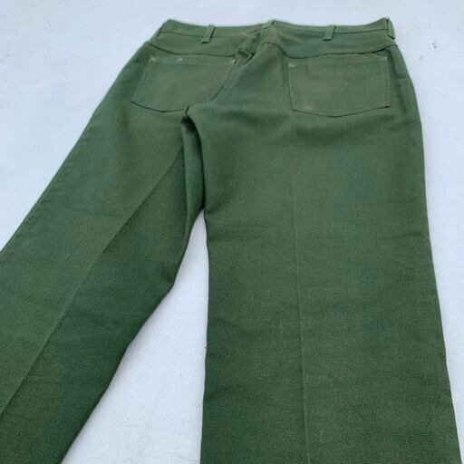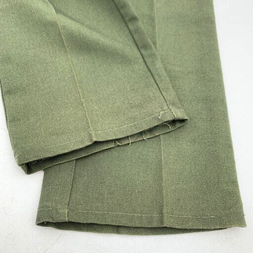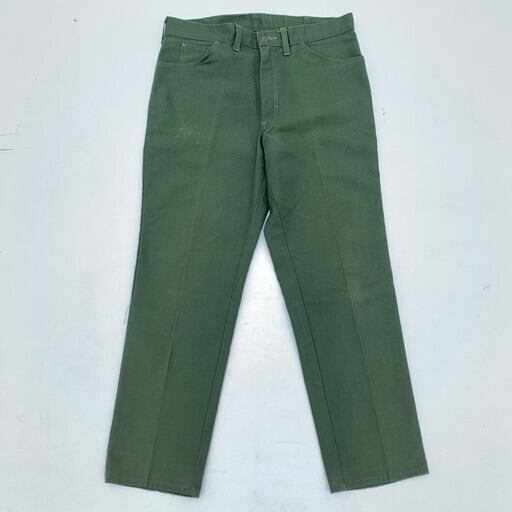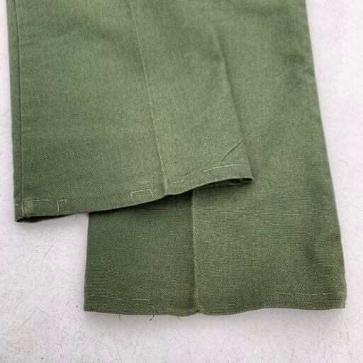60年代頃のUNKNOWN5Pホップサックパンツです。タグ欠損のためメーカー不明ですが、ストアブランド等のマイナーブランド物と思われます。ミリタリーアイテムを彷彿させるオリーブカラーで、生地はホップサックです。リーバイスで言うスタプレに似たタイプで、こちらはストーレートシルエットです。トップボタンはストアブランド等で使われている物を使用し、グリッパーのカムロックジッパーが採用されています。右腿付近にうっすらと色抜けがあります。裾のステッチが一部飛んでいますが、使用に問題は無いと思われます。シンプルでテーパードが綺麗なストレートパンツですので、様々なスタイリングで合わせて頂けます。スタプレのストレートをお探しの肩は代用に是非いかがでしょうか。