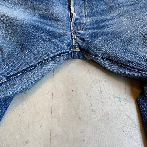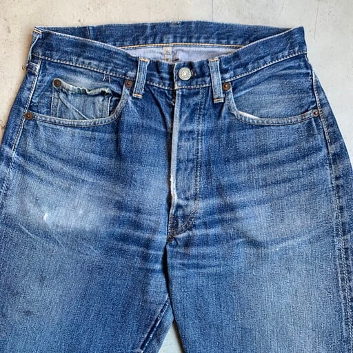 50年代から60年代初頭頃のLEVI'S 501XXです。1955年あたりから1962年頃までに製造されていた55モデル。紙パッチにGaranteedの文字が入るギャラ入りで、トップボタン裏ドット刻印(ポツポツ)、Vステッチ、銅リベット、隠しリベット刻印12、ウォッチポケットシングル耳なし、紙パッチ、両面赤タブBig E、均等V、オフセットループ。腿付近にはバランスよくヒゲも入り、濃淡のバランスもとても良い1本。パッカリングやセルヴィッジ跡もしっかりと出ています。印字は消えかかっていますが、紙パッチも奇跡的に残っています。アーキュエイトもイエローステッチが使われています。右腿とオフセットのベルトループにややダメージがございます。股に補強ステッチが施されています。ダメージを考慮してもグッドコンディションと呼べる程生地もしっかりとしています。実寸W31のゴールデンサイズ。永遠の定番であり、憧れの501XX。紙パッチが残り、状態の良い501XXはなかなか出ないので、サイズの合う方はこの機会に是非手にして欲しいスペシャルなヴィンテージデニムです。