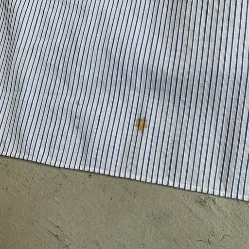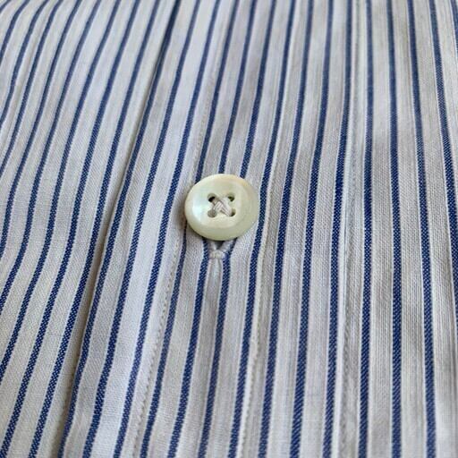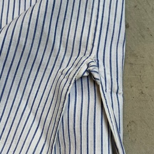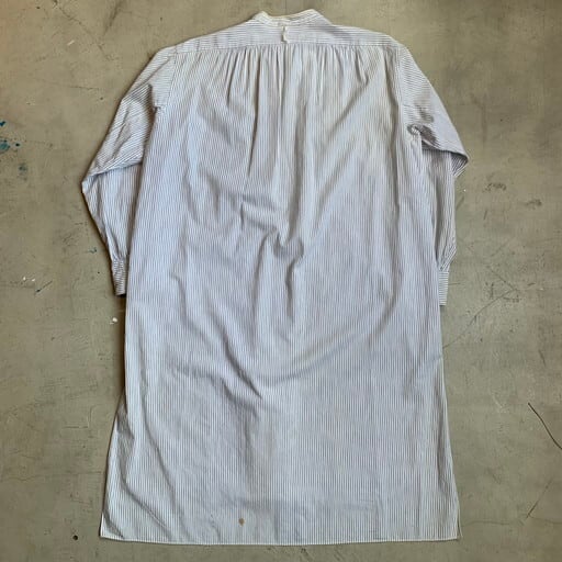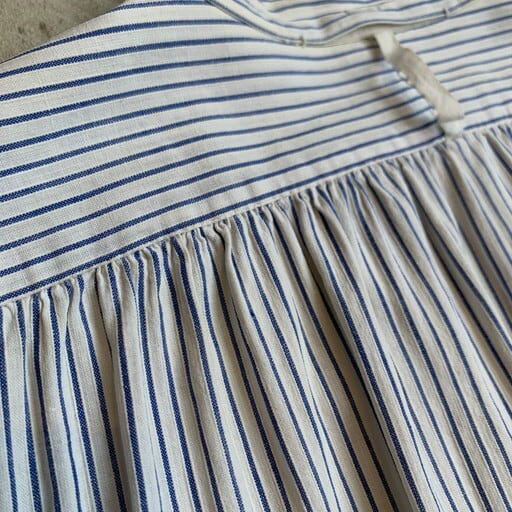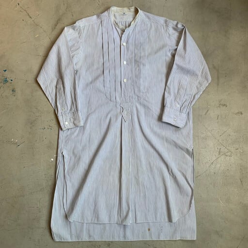 1900年代初頭頃のフレンチストライプスモックです。CARRIERE&RENARDというフランス人の名前が冠されたメーカーですが詳細は不明です。バンドカラーに烏賊胸、カフスやヨーク部分に細かく入ったプリーツ等古いディティールです。現在はシェルボタンが使用されていますが、元は拝みボタンが使われていた為ボタンホールが両サイドに付けられています。サイドのスリットにはマチもございます。襟元に黄ばみ、左袖のボタンが1つ割れており、左肩に小さな擦れがございます。後身頃裾にシミがございます。100年程前のアンティークと呼ばれる部類のアイテムとしては非常に状態も良いのではないでしょうか。サイズも希少なメンズサイズです。ゆるめのパンツにグルカサンダル等で合わせてみてはいかがでしょうか。