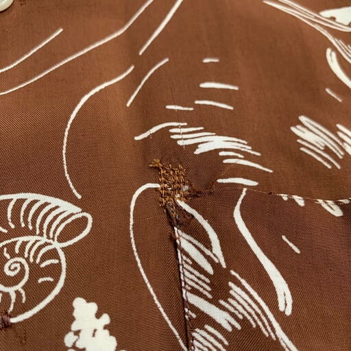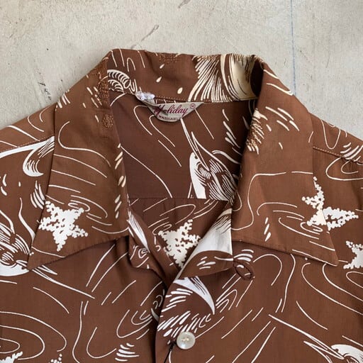 40年代から50年代頃のHolidayレーヨンアロハシャツです。1940年代頃からボーリングシャツで有名なKing Louis(キングルイ)を展開していたブランドです。全面にプリントが施されたオールオーバーパターンで、ソードフィッシュ(カジキ)や巻貝、ヒトデなど海の生物が潮の流れと共に描かれています。ヴィンテージアロハでブラウンの白抜きは意外と見つからないと思います(多色の物は見かけます)。襟元、ポケット縁、背面裾にリペアが有り、袖口は擦れによるダメージが見られます。シミも所々見られます。サイズはMで着易いサイズ感です。切りっぱなしの色褪せたデニムにサンダルでラフなスタイルに合わせて見てはいかがでしょうか。
