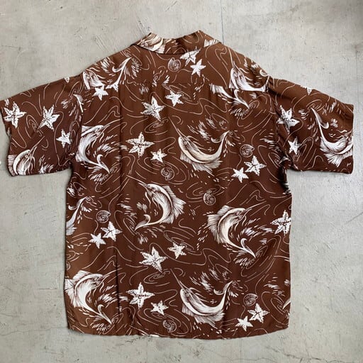 50's Holiday レーヨンアロハシャツ ハワイアンシャツ ブラウン SWORDFISH柄 ヒトデ 巻貝 カジキ オールオーバーパターン レアカラー Mサイズ 希少 ヴィンテージ BA-1027 RM1396H