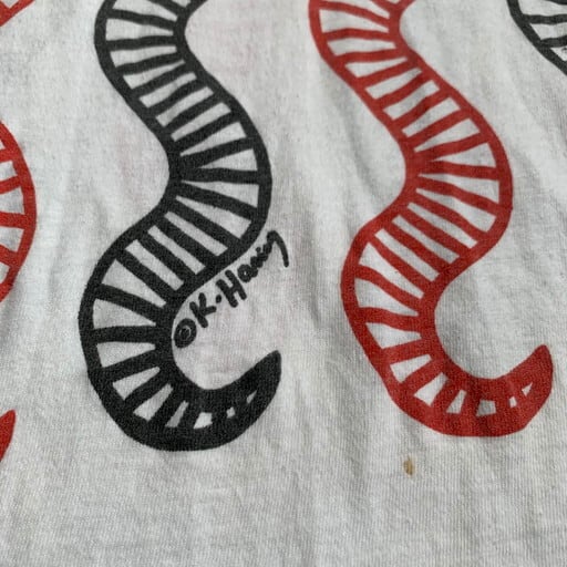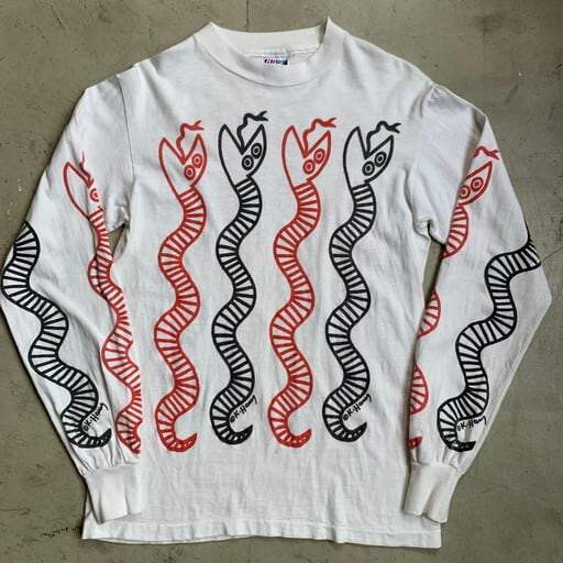 80年代頃のKeith HaringプリントロンTeeです。キースヘリングのアートの中でも登場することもあるスネークが黒と赤の2トーンで,ボディと両袖にプリントされた非常に珍しいデザインです。色違いも存在するようですが、古着市場での出現率が極めて低いので定かではございません。左胸に小さなピンホールやシミ、使用感はございます。サイズはSで小さめですので、女性の方や細身の方にお勧めしたい1着です。キースヘリングのTシャツの中でもレアプリントとされているアイテムですので、サイズが合う方や、コレクションにいかがでしょうか。