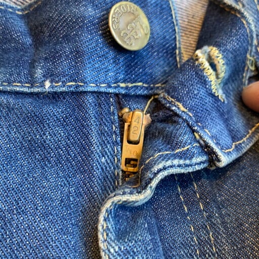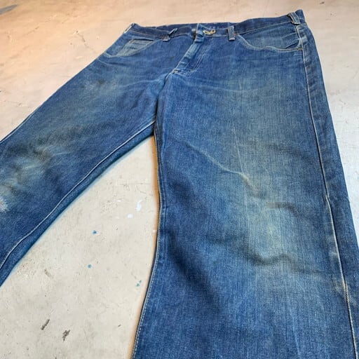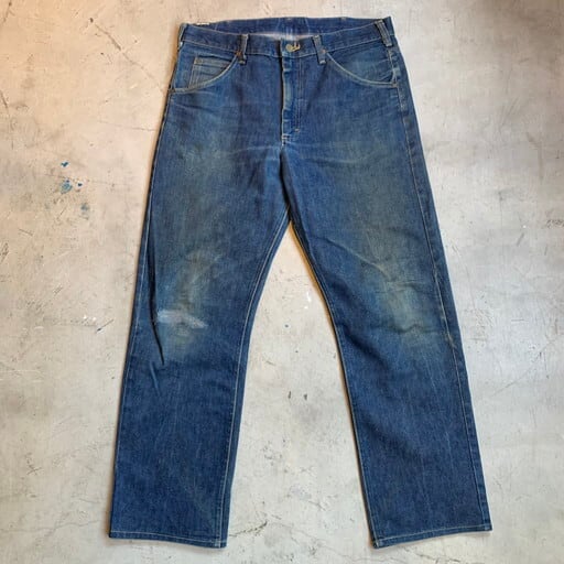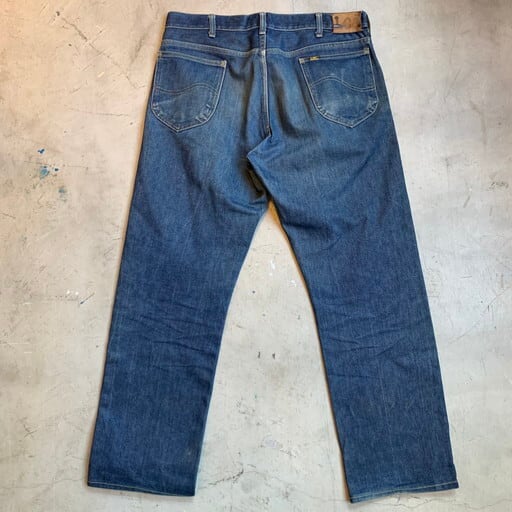 70年代から80年代頃のLee 200ストレートデニムパンツです。101の後継バックポケット内側に当て布が無いモデルです。フロントは42TALON、ピスマークには®、MR入り。ハンドポケットのスレーキ縁にユニオンチケット有り。シミや擦れなども見られ、右膝にリペアがございますが、濃淡のメリハリが良いアジを出していて、年代的には浅めですが、革パッチの縮み方等ヴィンテージさながらの雰囲気を醸し出しています。まだ色が濃い部分もありますので、育て甲斐のある1本といえます。W36位でゆったりとしたサイズ感です。200番台のデニムは色落ちしている個体が多いので、濃い目を探されていた方は必見なアイテムです。