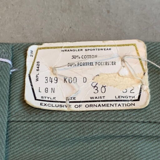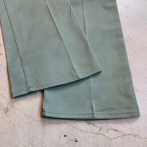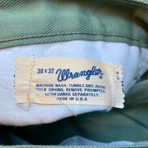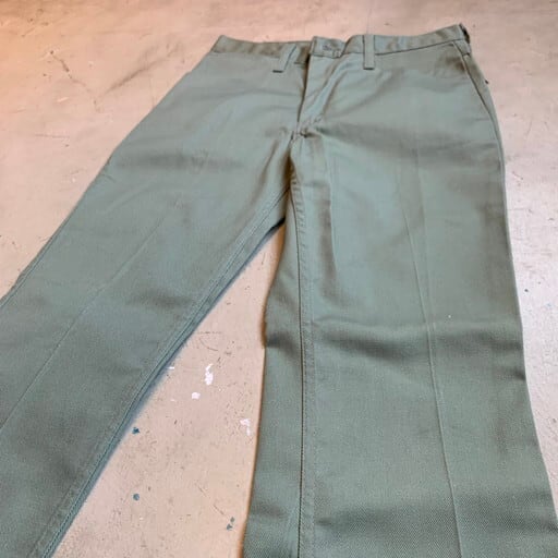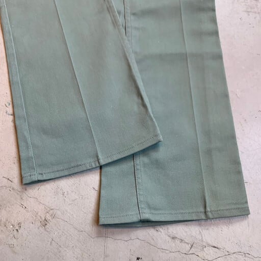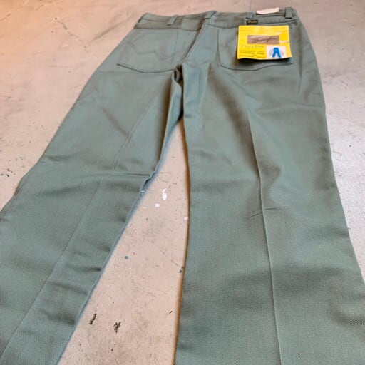 70年代から80年代頃のWRANGLER Flea Leg JEANSブーツカットパンツです。フラッシャーが残るデッドストックです。マットな印象のUSAFを彷彿とさせるセージグリーンで、裾に向かって緩やかに広がったシルエットが綺麗です。保管時による若干の擦れなどはございますが、気にならない程度です。フロントはTALONのセミオートマチックジッパーを使用しています。USA製で、サイズ表記はW30ですので、女性でも穿き易いサイズです。ラングラーのカラー物のデッドストックはあまり出ませんので、ラングラー好きな方やブーツカットをお探しだった方は必見です。