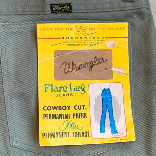 70's 80's WRANGLER Flare Leg JEANS ブーツカットパンツ デッドストック フラッシャー付き セージグリーン NOS W30 USA製 TALON セミオートマチック 希少 ヴィンテージ BA-1033 RM1402H