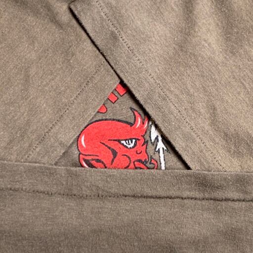 80年代頃のレッドデビル ベトナムプリントTeeです。ワッペンやスーベニアジャケットでも見られるレッドデビルとベトナムのマップが描かれています。ボディはHanesを使用しています。袖、裾共にシングルステッチで、色褪せたオリーブカラーが良い雰囲気です。全体に使用感が有り、毛羽立ちも見られます。色の配色も申し分ないグッドデザインですので、NAM戦関連のアイテムやスーベニアアイテムがお好きな方は是非いかがでしょうか。サイズはM表記です。MADE IN USA。