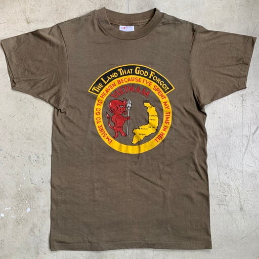 80's Hanes レッドデビル ベトナムプリントTシャツ スーベニア NAM戦 THE LAND THAT GOD FORGOT オリーブ シングルステッチ Mサイズ USA製 希少 ヴィンテージ BA-1039 RM1408H