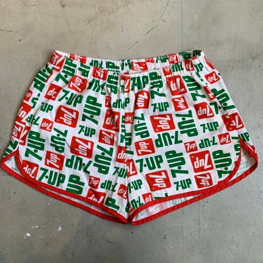 70's 7UP 総柄コットンスイムショーツ オリジナル モノグラム Lサイズ レトロ パイピング 白 赤 緑 企業モノ 希少 ヴィンテージ BA-1042 RM1411H