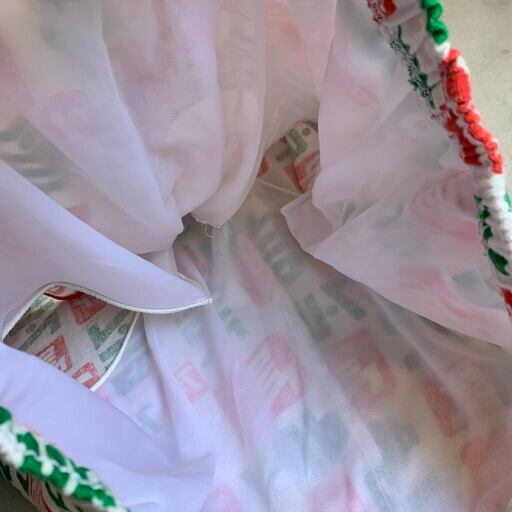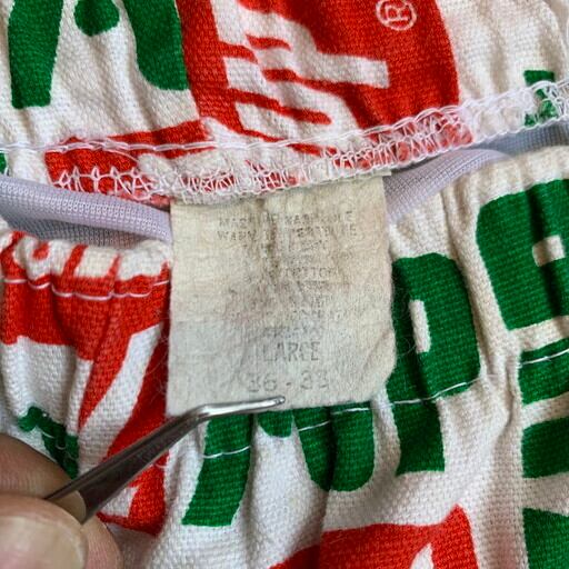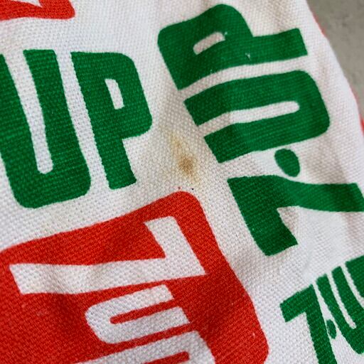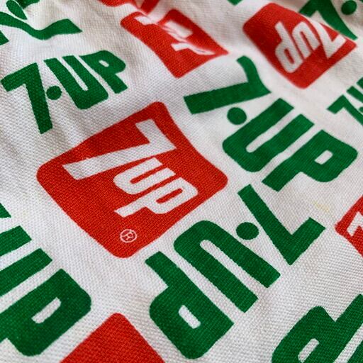 70年代頃の7UP総柄コットンスイムショーツです。7UPの人気のファブリックを使用したアイテムで、ボディはコットン、内側はナイロンサポーターが付きます。ウエストがゴムなので、15cmくらい伸びます。裾のパイピングがレトロな雰囲気です。小さなシミがフロント、バックサイドにございます。色褪せも無く発足の良い染み込みプリントです。表記はございませんが、恐らくUSA製ではないでしょうか。同じメーカーがバドワイザー柄なども製造していたようですが、この7UP柄は圧倒的に見つからない珍しいアイテムです。水着としても良いですが、タウンユースでお使いになられてもインパクトがあって良いのではないでしょうか。7UPコレクターは是非いかがでしょうか。
