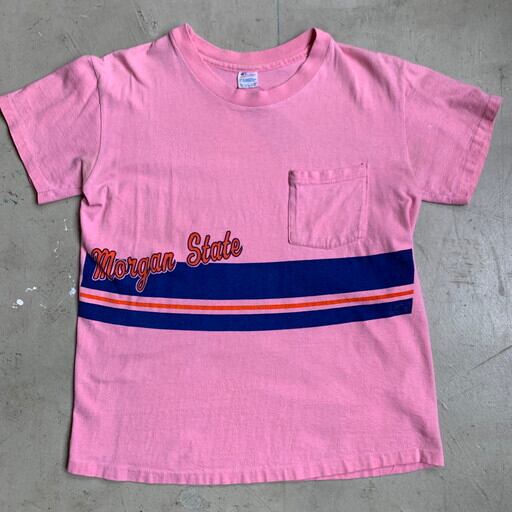 80's Champion チャンピオン 染み込みプリントTシャツ トリコタグ 胸ポケ Morgan State カレッジ ピンク シングルステッチ Mサイズ USA製 希少 ヴィンテージ BA-1046 RM1415H