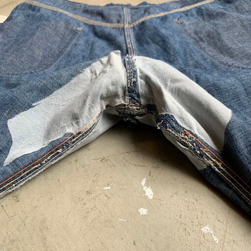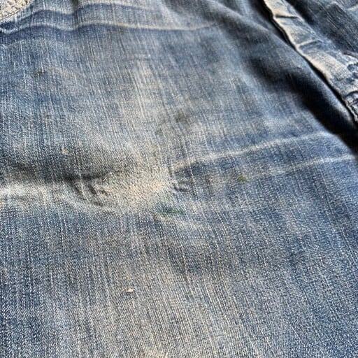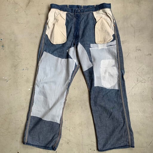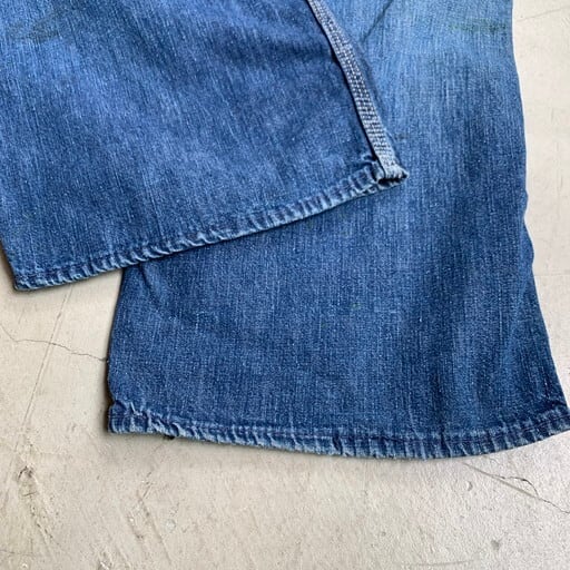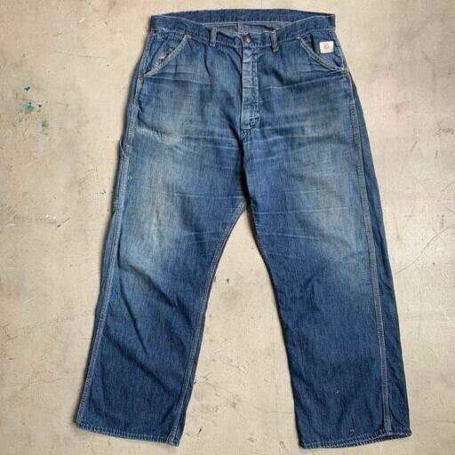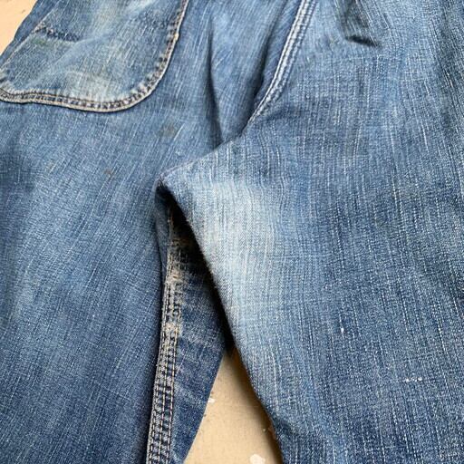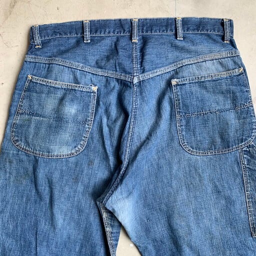60年代頃のSTRONG RELIABLEデニムペインターパンツです。アメリカ3大ストアで有名なSearsが展開していたワークウェアに特化したプライベートブランドです。フロントはSRの刻印が入るスナップボタン、GRIPPER ZIPPERのカムロックジッパーが採用されています。ポケット縁には鉄製のリベットが打ち付けられています。程よく濃淡が分かるヒゲやアタリが出ており、所々に見られるシミやペンキがワークウェアらしい雰囲気です。右腿にタタキがございます。写真の通り腿や内股の生地が薄くなっている箇所は接着芯で補強されています。ライトオンスで、色落ちのバランスも良くW36とゆったり目なサイズですので、これからの季節に重宝します。お勧めな1本です。