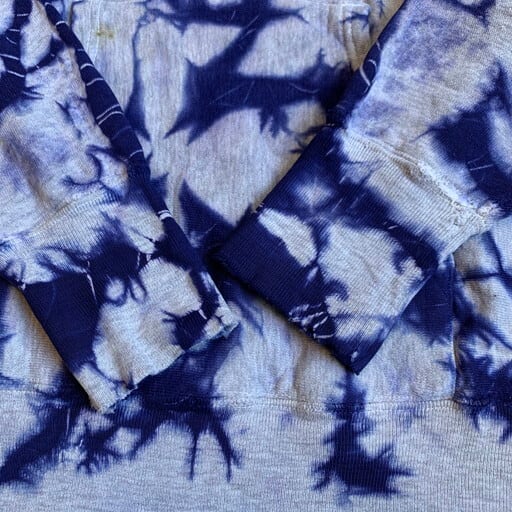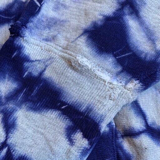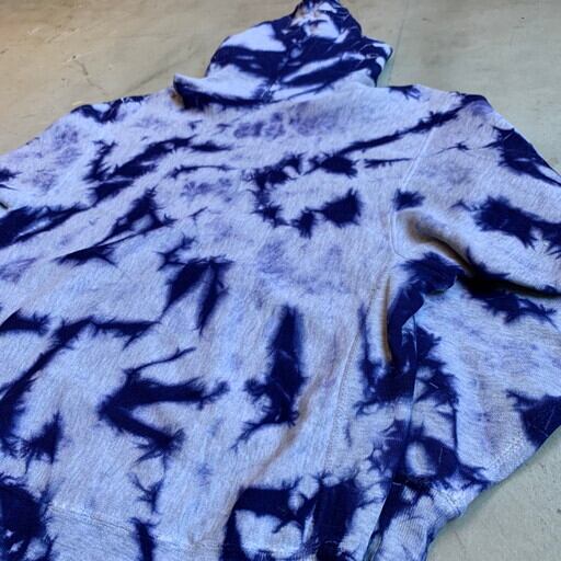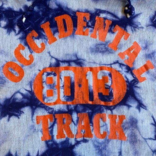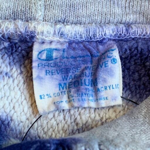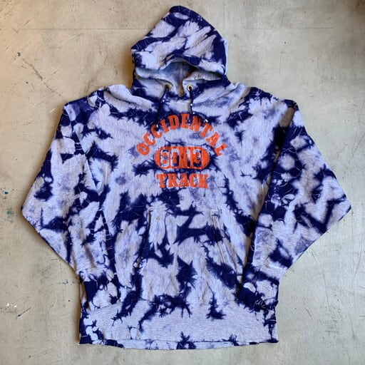70年代から80年代のChampionチャンピオンのリバースウィーブスウェットパーカーです。トリコタグ以前の希少な単色タグが付きます。コットン82%アクリル12%レーヨン6%の比率の単色タグの最終後期あたりのモデルです。1887年にカリフォルニア州で設立されたオクシデンタル大学の陸上部のプリントが3段入っています。カプセル内の80-13は1980年という意味の可能性が高いように思います。小ぶりなフードに縁が平らなハトメなど単タグ特有のディティールです。元はグレーですが、タイダイで後染めされていてオレンジとブルーのバランスがGOODです。フードと袖口にややダメージが見られます。最近のリバースウィーブ人気でパーカーが枯渇していますが、単色タグのパーカーでタイダイとなるとなかなか出ないアイテムですので、サイズが合う方は是非この機会にいかがでしょうか。