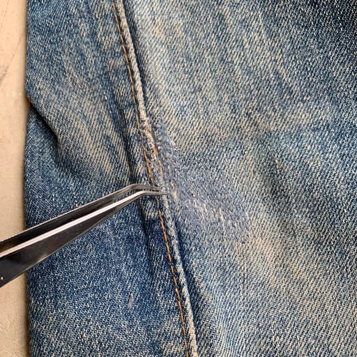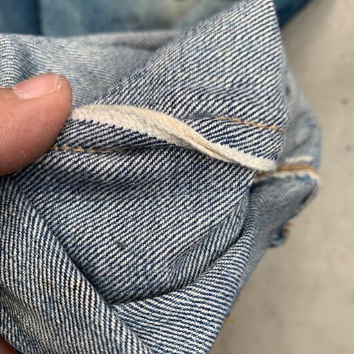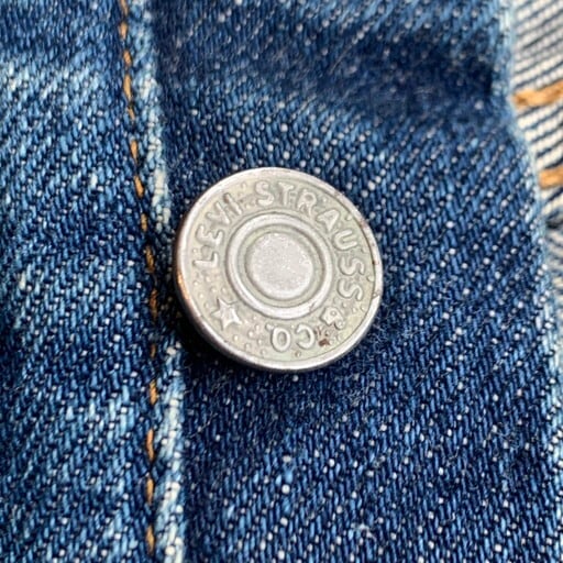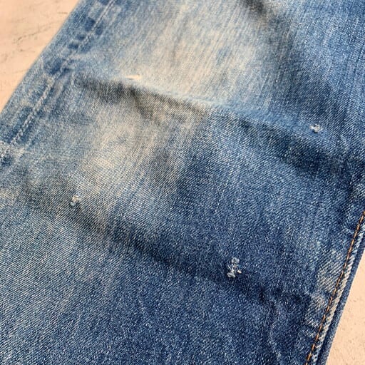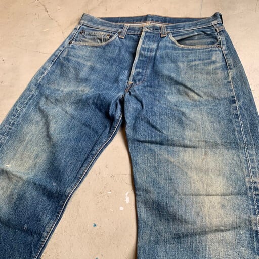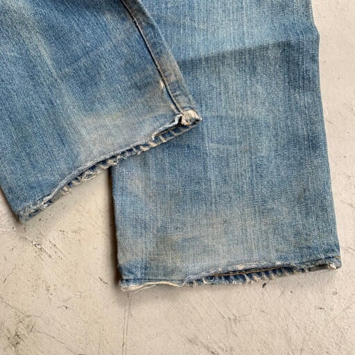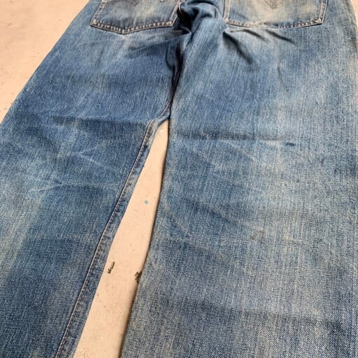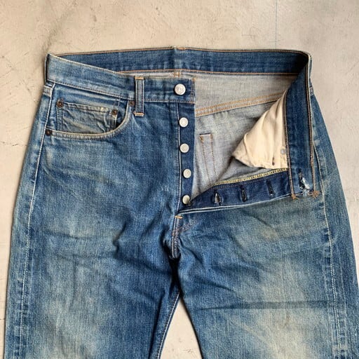 60年代から70年代頃のリーバイス501です。トップボタン裏刻印6、フライボタン刻印E、平行ステッチ、通常R、ウォッチポケットチェーン、セルヴィッジ裏両面シングル、バックポケット裏シングル。スレーキにスタンプが入っていたと思われます。紙パッチや赤タブが欠損していますが、フライボタンに使われている刻印Eや、セルヴィッジ裏が両面シングルというディティール等501Big Eから66へと移行する極めて短い期間に存在していた66Big Eモデルと推測しています。両膝付近やバックポケットに小さなダメージがいくつかございます。右の内くるぶし付近にリペアがございます。裾は擦れによるダメージがございます。濃淡がはっきりとしていて、ハチノスもうっすらと入りヴィンテージ感溢れるデニムです。サイズはW32のゴールデンです。無地の白Teeに合わせたい1本です。