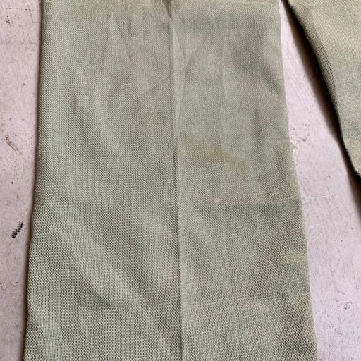 70年代頃のLeeホップサックスストレートパンツです。フラッシャー付きのデッドストックです。淡いカーキ色のこちらは、コットン混紡のホップサック地で、リーバイスのスタプレに似たモデルです。42TALONに黒黄のタグがスレーキに付きます。後のピスネームは大文字仕様です。バックポケットはウェルト(縁取り)の無いスリットポケットになっておりヨークに沿って配置されているので後から見た時にすっきりとした印象です。ブーツカットでは無くストレートという点も評価が高いのでは無いでしょうか。センタープレス跡にうっすらと気にならない程度のヤケがあり、左膝後にシミが見られます。色も爽やかでカジュアル過ぎないデザインですのでON/OFF使えるアイテムです。