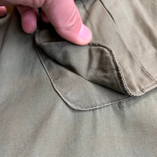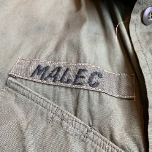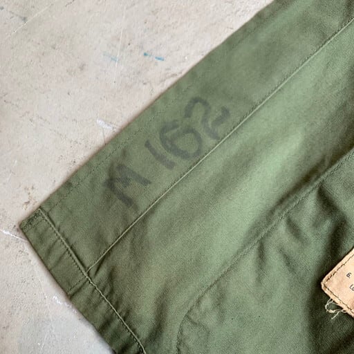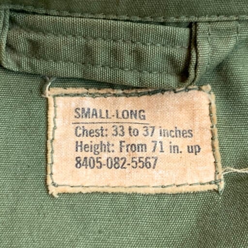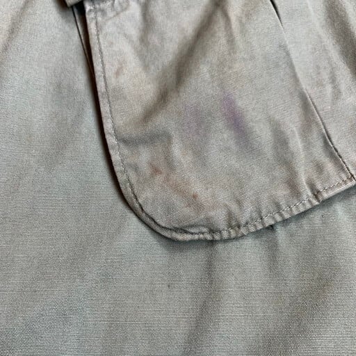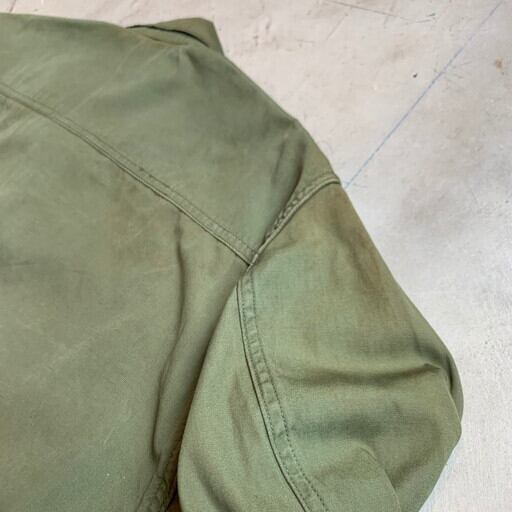 60年代のU.S.ARMYジャングルファティーグジャケットです。DSA100-67-C-0018。ファティーグジャケットの中では3rdタイプとして位置づけられているこちらは1st、2ndに見られるエポーレットは無く、ポケットの底の水抜き用のドレンホールが省略されています。ボディは4thになるとリップストップという裂け防止の格子状の生地へと変わりますがこちらはノンリップのコットンポプリン地となっております。襟と両胸、左腕にパッチが付きます。襟やポケット、袖や背面にシミや汚れが見られます。生地にダメージは特にございません。SMALL-LONGですので、ハーフコート間隔で羽織れます。バブアーでいうBEAUFORT位の着丈イメージです。ジャングルファティーグのノンリップは価格も高騰していますので、サイズが合う方は必見です。