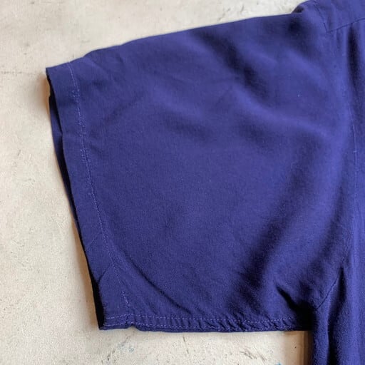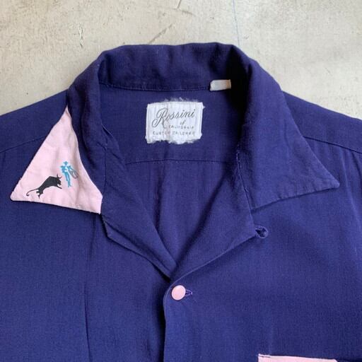 60年代頃のRossini of Californiaコットンレーヨンシャツです。一番上がループになったオープンカラータイプで襟は袋縫いです。襟裏に襟芯が入る仕様ですので60年代から70年代頭頃に製造された物と思われます。右襟と胸ポケットに切り替えが入った珍しいデザインで、闘牛の様子がプリントされています。多少の使用感はございますが、首タグのほつれ以外特にダメージはございません。ロカビリーのような雰囲気もあり、白黒のサドルシューズなどで合わせても非常にかっこよいと思います。テロっとした生地感ですのでタンクトップの上からさらっと羽織ってみてはいかがでしょうか。