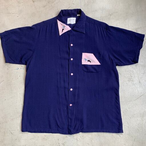 60's Rossini of California コットンレーヨンシャツ 開襟 オープンカラーシャツ 闘牛士 ネイビー ピンク ロカビリー Lサイズ 希少 ヴィンテージ BA-1081H RM1450H
