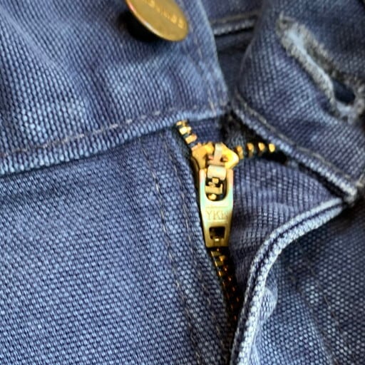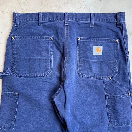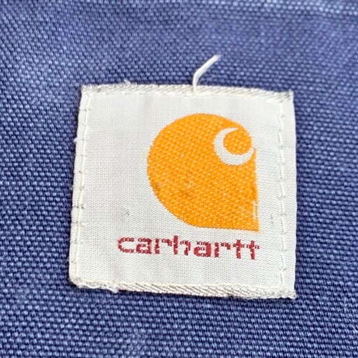 80年代から90年代頃のcarharttダックペインターパンツです。定番のダック地を使ったワークパンツで、程よくフェードしたインクブルーのようなネイビーカラーが良いアジでています。品質タグは印字が殆ど消えかかっておりますが、84年から90年代に使用されていたCRAFTED WITH PRIDE IN USAのスターマークがかろうじて確認できます。右腿、左膝裏、裾付近に若干のダメージがございます。ユーロワークウェアを彷彿とさせる色合いでこれからの経年変化も十分に楽しめる1本です。今では希少となったUSA製ですので、お探しだった方やカーハートがお好きな方は是非いかがでしょうか。W37~38とゆったり目です。