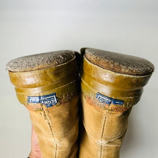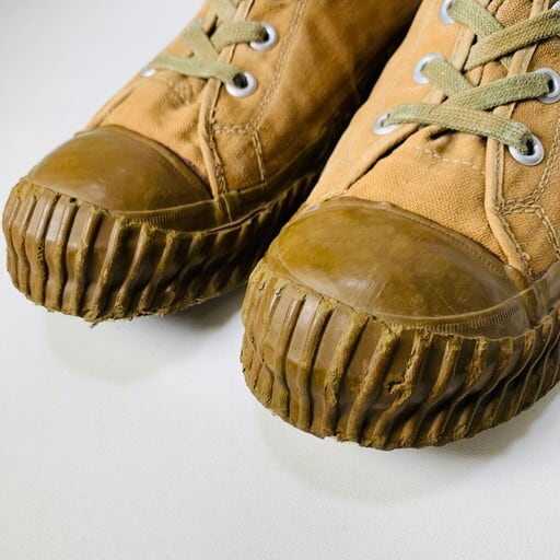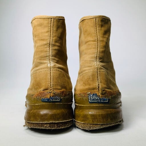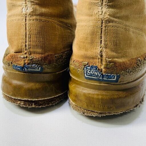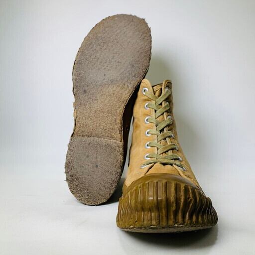 40年代頃のCONVERSEキャンバススニーカーです。米軍に納入されていたとされていますがこちらは、主にハンティングやフィッシングなどに使われていた物と思われます。アウトソールがフェルトを採用したウェーディングシューズタイプで、湿地や水辺での使用を想定したもので、水に濡れると膨張する事で接地面が広がり滑りにくくなるとされており、現代のフィッシング用のウェーディングシューズでも使われている仕様です。土や泥などの侵入を防ぐ為シュータンはアッパーと一体型となっています。メッシュのような細かい穴が開いたハトメも特徴的です。サイドのラバーテープに劣化があり所々剥がれています。ヒールパッチはほぼ欠損しております。フェルトソールに減りもみられます。硬化は見られず着用に問題はなさそうです。サイズ表記が消えてしまっていますが、90'sのALL STARのUS9.5と比べたところ約1cm大きかったのでUS10~10.5相当と思われます。現行の物に比べワイズにややゆとりがあります。紐をぎゅっと締め上げて履くと非常にかっこいいと思います、踵減りはありますが、ウェーディングのソール交換のように新たに踵のフェルトを張り替えると良いかもしれません。決して状態が良いとは言えませんが、80年程前の代物と考えると歴史的価値も含めて大変希少です。リペアをしながらでも履き続けて欲しいスペシャルな1足です。