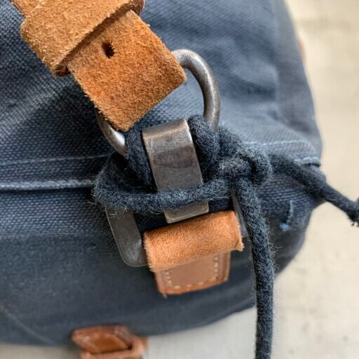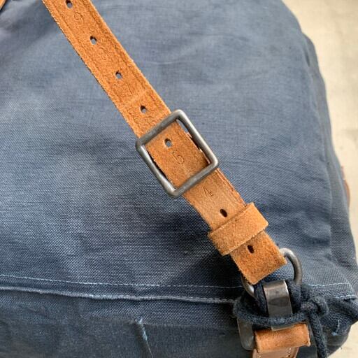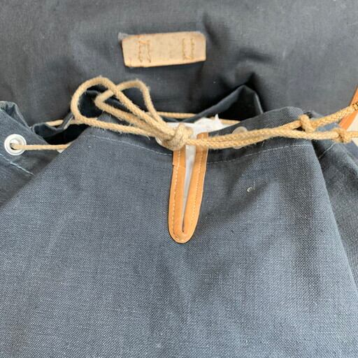 50年代のP.P.Berlinキャンバスリュックです。P.P.BerlinとはPolizei Prasident Berlinの略で、ベルリン警察を意味しています。第二次世界大戦直後の1950年代初頭に使用されていた物と思われます。大きなスクエア型で、外側にはポケットはございません。内側にはスナップボタンで開閉できる仕切られたポケットが1つございます。フラップのパイピングレザーに一部割れがございます。ショルダーストラップは下部の金具に引っ掛ける作りをしていますが、荷物が入っていない軽い状態だと外れやすい為紐で固定されています。(簡単に解けます)経年による退色はございますが、生地はまだまだ丈夫で綺麗な個体だと思います。ゆったりと大きめなので、2~3日の旅行などにもお使い頂けます。あまり見かけない珍しいスクエアタイプですので、ユーロ物がお好きな方は是非いかがでしょうか。