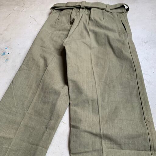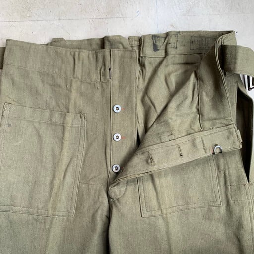 40年代頃のフランス軍モーターサイクルパンツです。しっかりとしたコットンのキャンバス地で、フロントはフックにアルミボタン。L.F.C.Mの刻印が入った同素材のベルトで調整できます。裾にも絞れるストラップ付。マリンパンツのような四角いパッチポケット仕様で、バックにはポケットは付きません。前面内側は生地が2重でダブルニーとなっています。本来はバイクに乗る際に履いているパンツの上から着用するオーバーパンツですので、サイドから内側へ貫通したポケットがございます。ウエスト内側にスタンプが押印されていますが、読み取れません。恐らく水の通っていない状態で、デッドストックもしくはそれに近いミントコンディションです。左膝付近に小さな薄汚れが確認できます。近年の人気で注目度が一気に上がったフランス軍のモーターサイクルパンツですのでお探しの方も多いのではないでしょうか。W36~37ですが、ウエストをぎゅっと絞って穿くには程よい大きさではないでしょうか。