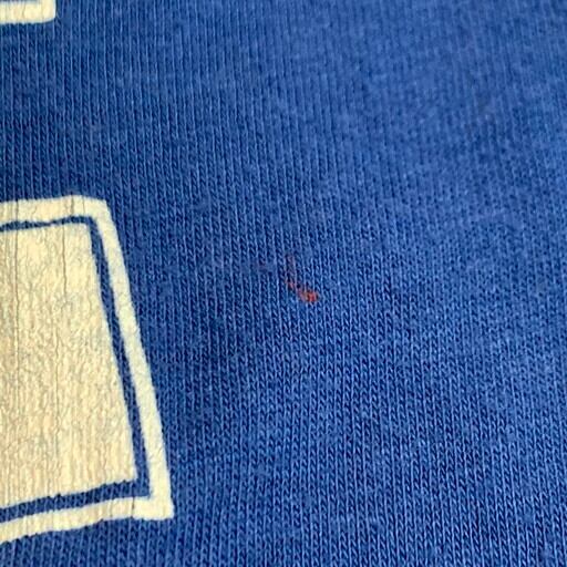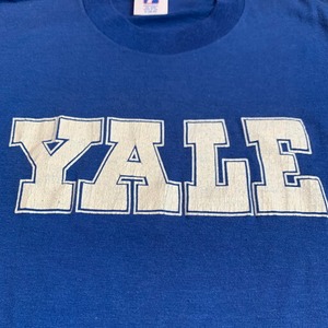 80年代から90年代頃の”YALE”カレッジプリントTシャツです。今やチャンピオンのスウェットで有名なYALE大学は、1701年に創設され、アメリカ国内でも3番目に長い歴史を持つ由緒ある名門大学です。フロントに縁取りされたYALEの文字がラバープリントされています。袖、裾共にシングル捨て地でボディはLOGO7。プリントにクラックが入り、やや毛羽立ちが見られます。目立つダメージはございませんが、裾裏にピンホール、小さなペンキのような汚れがフロントロゴ横にございます。サイズ表記はMですが、身幅はタイト目です。シンプルな