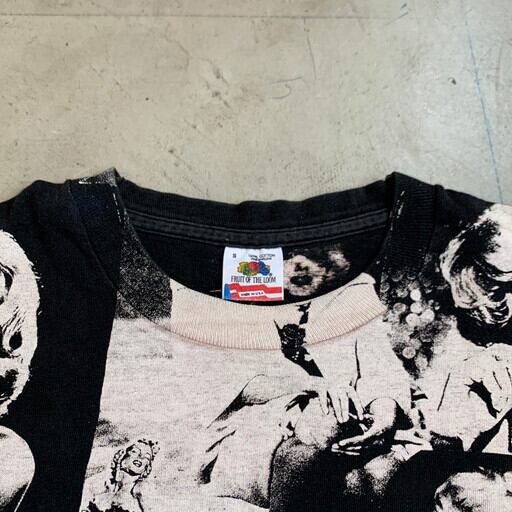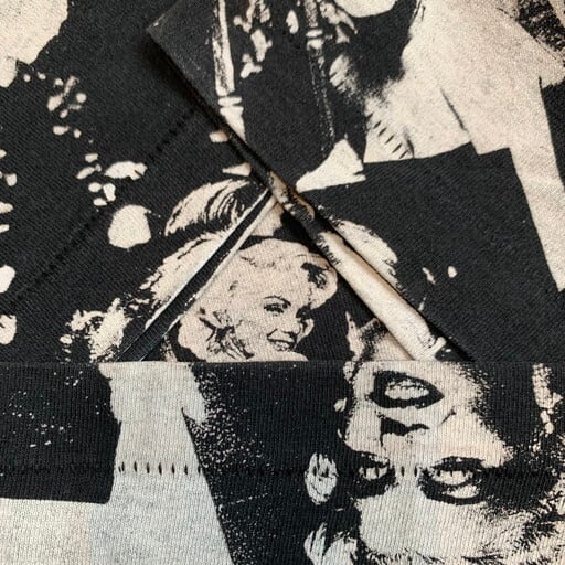 90年代頃のマリリンモンロー総柄プリントTシャツです。1950年代に人気を博したセックスシンボルで有名な女優マリリンモンローの写真が全面にプリントされた1枚です。ボディはUSA製で、袖、裾共にシングルステッチのFRUIT OF THE LOOM。こちらの個体ではコピーライトの印字が無く、コピーライトが入った個体だとフロントとバックに確認する事が出来る為、当時のブートレグだと思います。澄ました表情やセクシーな表情が所狭しとプリントされ夏のコーディネートの主役を張るには十分なインパクトです。Sサイズですので細身の男性から女性の方でも着易いです。使用感は少なく美品です。