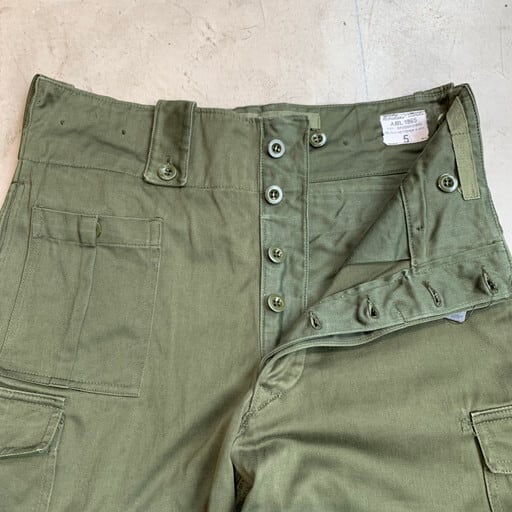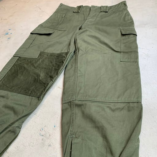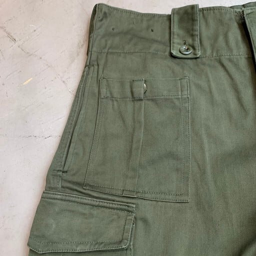 60年代のベルギー軍M-64フィールドパンツです。1965年製。裾にかけてテーパードの利いたシルエットが特徴で、裾はベロクロタイプで開閉、調整が出来る仕様です。しっかりと張りのあるコットンツイル地です。一見分かりづらいですが、右膝部分の生地の向きが90度違う為、角度によっては色味が濃くみえます(リペア等ではなくただ単に生地の向きを揃え忘れている)。使用感も少なく大変綺麗です。シルエットがユニークでコーディネートの幅も広がるのでは無いでしょうか。ユーロミリタリーも人気が高くなってきていますので、サイズの合う方は是非いかがでしょうか。実寸W34位。