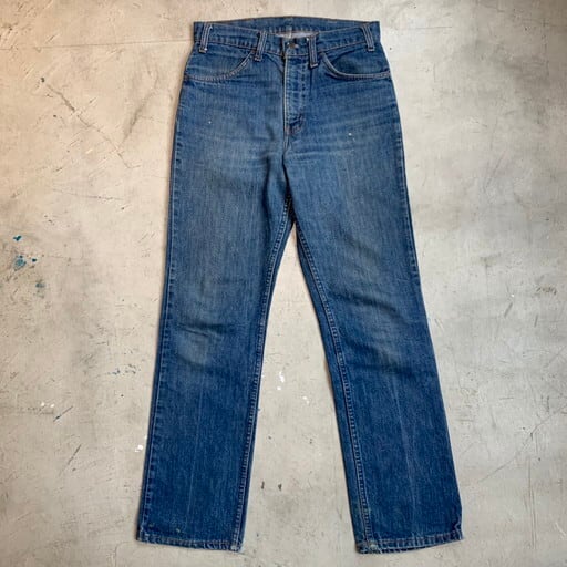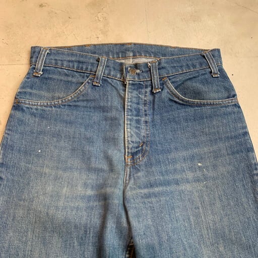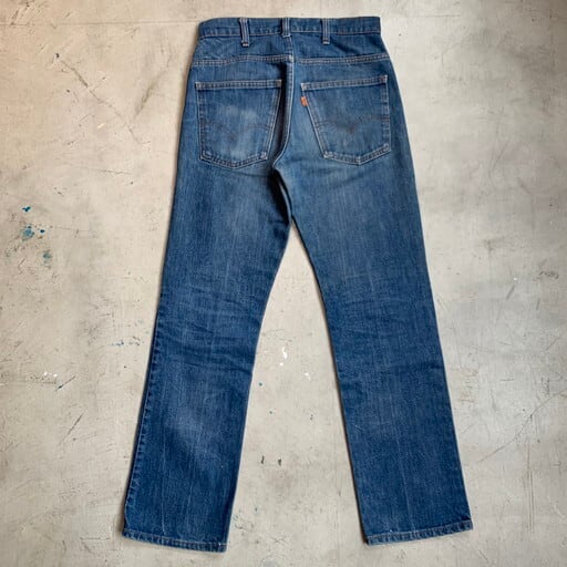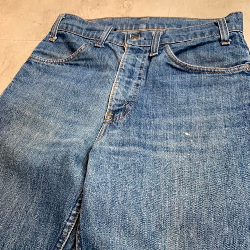 70年代のLevi's 519デニムパンツです。519といえばコーデュロイが有名ですが、70年代頃からデニムも存在しており、コーデュロイ等のほかの生地に比べ流通量も少なく希少と言われています。オレンジタブが付く70~80年代のモデルは特に希少性が高いとされています。トップボタン裏563、42TALON、オレンジタブスモールe。うっすらとヒゲが入り若干ペンキなどが腿や裾に飛んでいます。トップボタンのボタンホールがややゆるくなっています。紙パッチは欠損しています。色残りは5割ほどですが、しっかり穿き込めばメリハリも出せると思います。ウエストは実寸W30インチですので、男女共に着用しやすいゴールデンサイズです。シルエットが綺麗なので1本あると重宝します。価格が高騰する前にコレクションに加えてみてはいかがでしょうか。