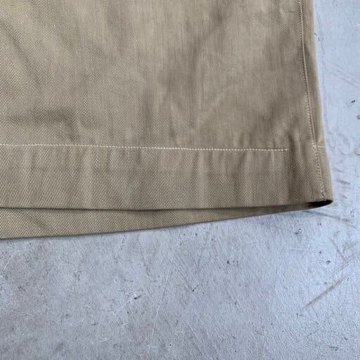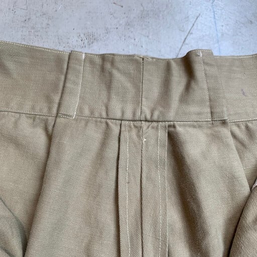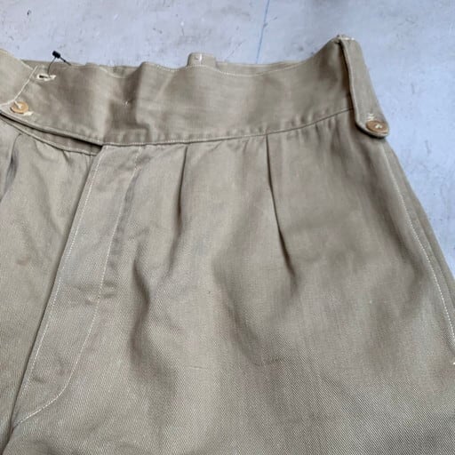 60年代頃のイギリス軍のものと思われるグルカショーツです。サイドのストラップが省略されたモデルで、コントラクト等記載が無い為詳細は不明。ウエストのバックがカスタムで詰めています。60年代後半のコントラクトでオリーブカラーの同タイプがあるようですが、こちらはステッチがシングルであったり微妙に仕様が違いますので、民製品かもしれません。使用感があり、うっすらと斑点のように色が抜けている箇所がございます。小さなシミ等もございますが、ダメージはほとんど無く状態としては良好と思います。ウエストがW33位で、バックのタックを解けばもう1インチ位広げる事が出来ます。暑い戦地での使用を想定されワタリもゆったりとしていますので、風通しも良くこれからの猛暑でも活躍するアイテムです。サイズが合う方は是非いかがでしょうか。
