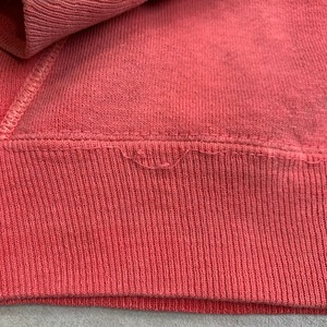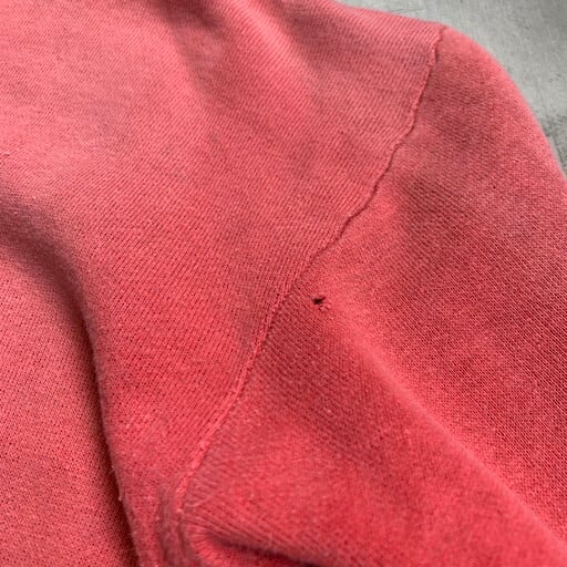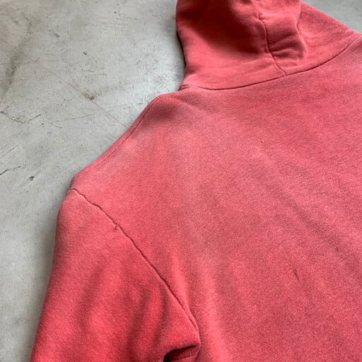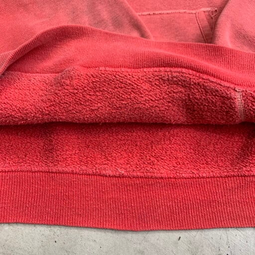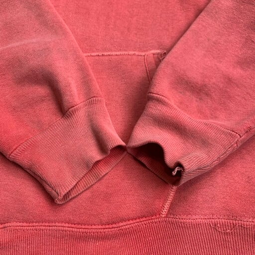 50年代から60年代頃のスウェットパーカーです。タグが無い為メーカーは不明ですが、恐らくストアブランド物だと思います。元は赤いボディーだったのが、経年や日焼けによってサーモンピンクのような色合いへと変化しており、唯一無二のムラ感が堪らない1着です。首元とポケット、アームホール後ろに小さな小穴があります。サイズは身幅もかなりゆったりとしていて、XLが縮んでこのサイズになったのだと思います。退色したレッドのパーカーはインナーでもトップスでも使いやすく1枚あるだけで、ヴィンテージ感が増しますので、是非この機会に1着いかがでしょうか。