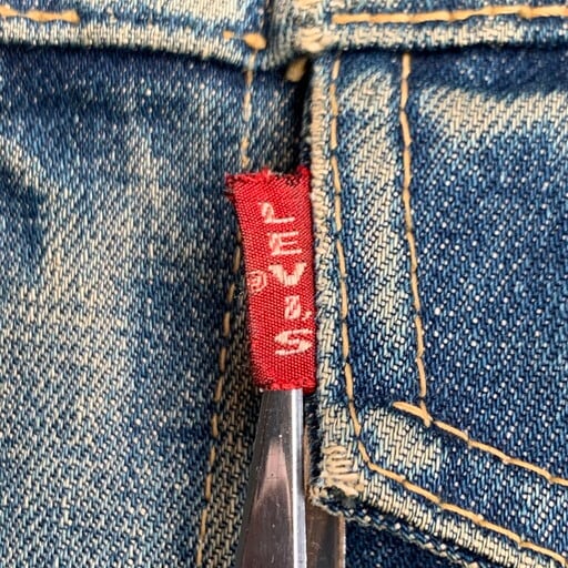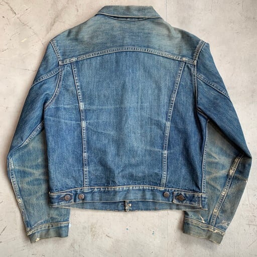 60年代頃のLEVI'S70505-0217デニムジャケットです。濃淡のコントラストが目を惹くアイテムです。Big Eの赤タブが付きますが、均等Vです。フラップ裏は表と同じデニムで、閂はブラック、ネイビーのダブルステッチ。裾や袖口のステッチはほとんど飛んでしまってますが、チェーンステッチです。全てのボタン裏が通常より1回り小さい物となっており刻印はございません。後から付け替えたのではなく元からの仕様のようです。首元のパッチは欠損していますが、70505でよく目にする小パッチでは無く557とのダブルネーム期頃に使われていた大パッチが付いていたと思われます。着丈も通常の70505に比べ幾分短めなおで、557から70505へモデルチェンジした直後あたりの個体ではないでしょうか。襟と両袖にリペアを施しています。袖口などに擦れも見られます。ヴィンテージらしい色落ちがそそられる1着ですので、サイズが合う方や、リペア等を楽しめる方は是非いかがでしょうか。40位。