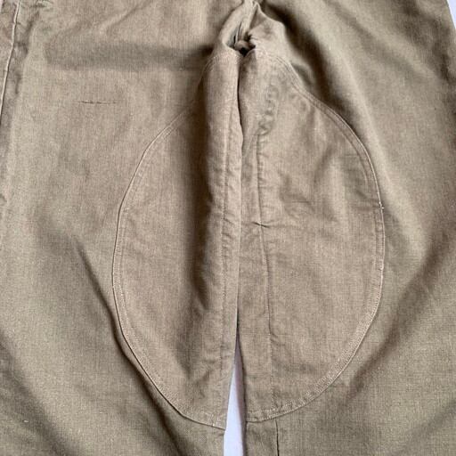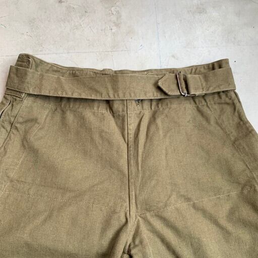 50年代頃のフレンチアーミーM-38モーターサイクルパンツです。厚手でしっかりとしたコットキャンバス素材です。M-38モーターサイクルコート(Pコートのようにボタンが配置されているタイプ)と上下で着用するモデルです。フロントはバイク乗車時の防風対策としてエプロン仕様となっております。基本オーバーパンツでゆったりとしているので、ベルトループの無い代わりに縫い付けられているウエストベルトを締め上げて着用します。サイドのポケットは貫通式となっています。多少使用感はございますが、特筆するダメージは無く良好です。フロントがエプロン仕様の物のほうが付いていないM-35モデルに比べ市場に出にくいのかな?といった印象です。ぎゅっと絞って白Teeをインして合わせるとトレンド感も出て良いと思います。