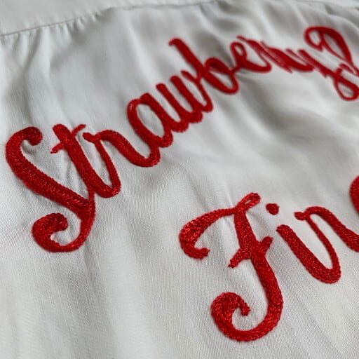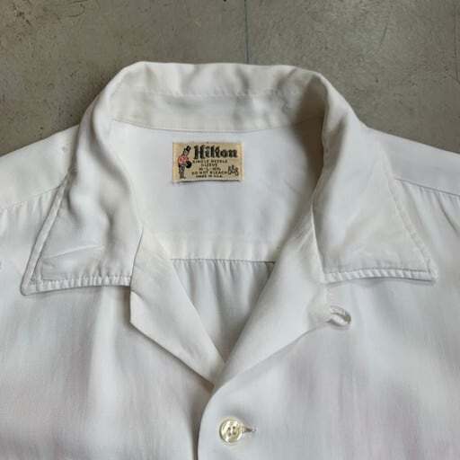 60年代から70年代頃のHiltonボーリングシャツです。とてもシンプルなホワイトボディにバックの赤いチェーンステッチが映える1着です。アイオワ州にあるStrawberry Pointの消防所の刺繍が入っていますので消防士たちのボーリングを楽しむ際に作られた物でしょうか。襟や肩などにこまかな擦れたダメージがございます。フロントボタン付け根の生地が弱っていたので、生地を内側に補填してボタンを取り付け直しました。サイズはLで程よくゆったりしているので、ワイドめなパンツに合わせて見てはいかがでしょうか。