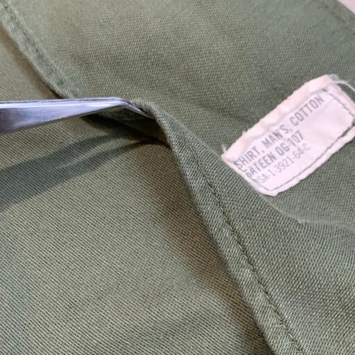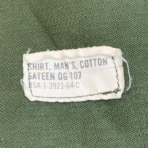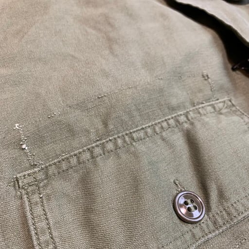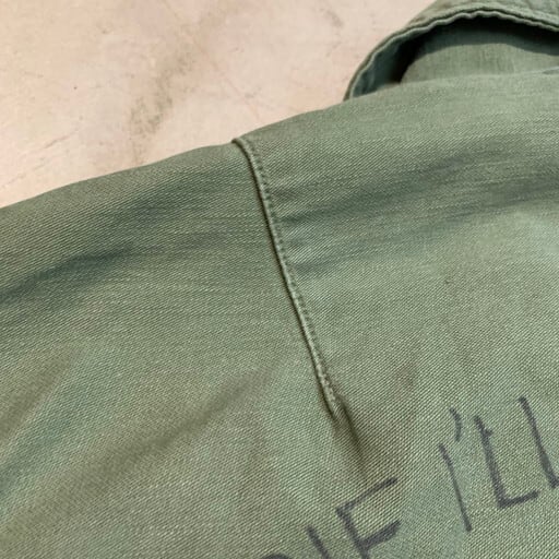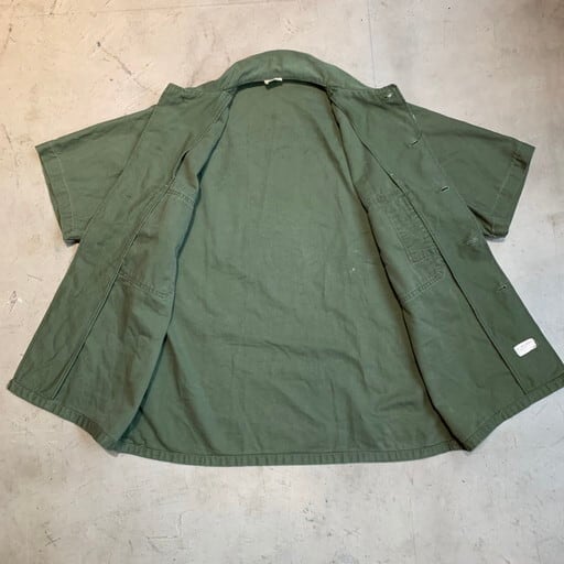 60年代のU.S.ARMY OG107ユーティリティーシャツです。コントラクトはDSA-1-3921-64-C。袖がカスタムで半袖になっていますが、コントラクトナンバーから筒袖の2ndモデルです(袖にストラップ付いているタイプ)。胸元にインシグニアが付いていた物が取り除かれています。背面にはベトジャンなどのスーベニアアイテムに見られるデザインがハンドペイントであしらわれています。フライングエースの表情がかわいい1着です。この手描きのデザイン自体当事物なのかは不明ですが、刺繍物とは違い非常に味のあるデザインです。サイズは15 1/2表記なのでMEDIUMですが、ややゆったりとしています。スヌーピーがお好きな方にもお勧めな1着です。