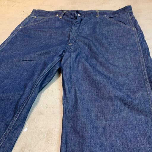 50年代頃のCOW POKE 5ポケットデニムパンツです。聞きなじみの無いマイナーブランドですが、パッチにもあるようにウェスタンウェアを手がけていたブランドと思われます。フロントはアルミのPRENTICEピンロックジッパーが使われています。バックポケットにも剥き出しリベットが採用されておろ、アーキュエイトに似たステッチが印象的です。パッチはレザーではなく合皮のようなプラパッチです。デッドストックをワンウォッシュしたようなミントコンディションです。生地は比較的ライトオンスの物が使用されています。ウエスト実寸W42インチとかなり大きいサイズです。なかなかここまで大きなサイズのウェスタンデニムは見かけないと思います。育て甲斐のある濃紺ミントコンディションですので、サイズが合う方は是非いかがでしょうか。