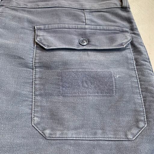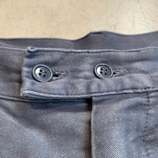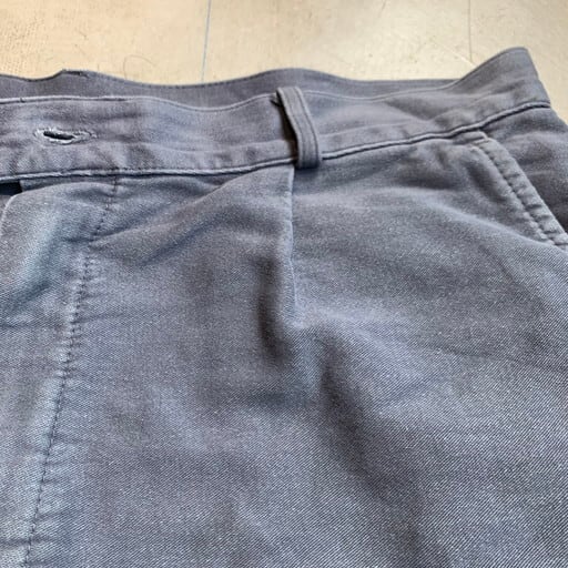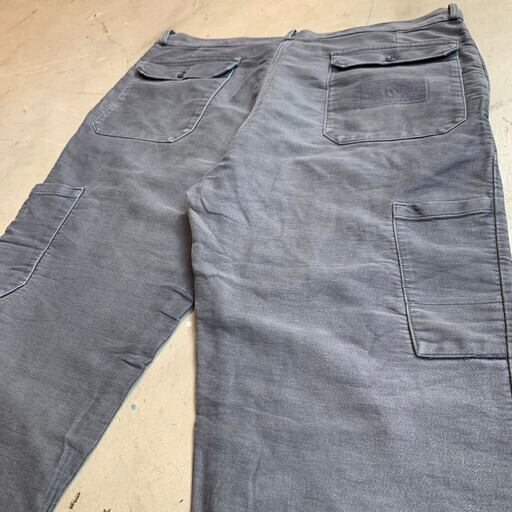80年代前後のものと思われるモールスキンワークパンツです。フロントにタックが入りペインターパンツのようにサイドにもポケットが付く仕様です。元々バックポケットには1938年に創立されたMANUTENCOOPというイタリアの医療関係のワッペンがついていたので、イタリアのワークウェアメーカーが製造していたかもしれません。付いていたワッペンはあまり状態が良くなかった為除去しました。全体に程よくフェードしており、モールスキンらしい風合いが楽しめる1本です。フロントにタックがある為フランス軍のM52チノのようなシルエットです。