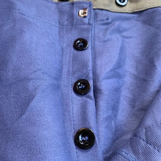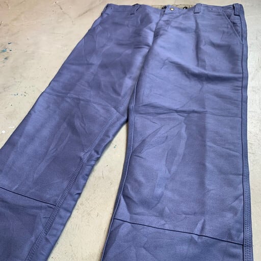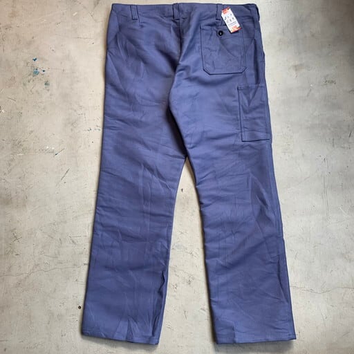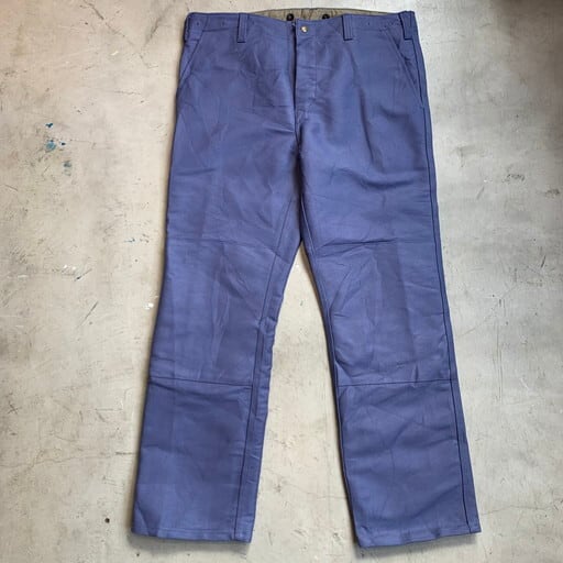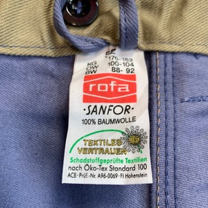 rofaジャーマンモールスキンワークパンツです。タグの付いたデッドストックです。製造年は比較的古くなく90年代から00年代の物と思われます。ユーロワークといえば、インクブルーやグレー、ブラック等が有名ですが、こちらは少し変わった色をしており、Glaublau(青灰)という色となります。コンバースでいうライラックやラベンダーに少しグレーを足したような非常に爽やかな色合いが素敵です。サイズは大きめでW40ですが、内側にボタンもあるので、サスペンダーで吊って穿くことも可能です。洗濯で多少の縮みはあると思います。パープル系の色がお好きな方は是非いかがでしょうか。