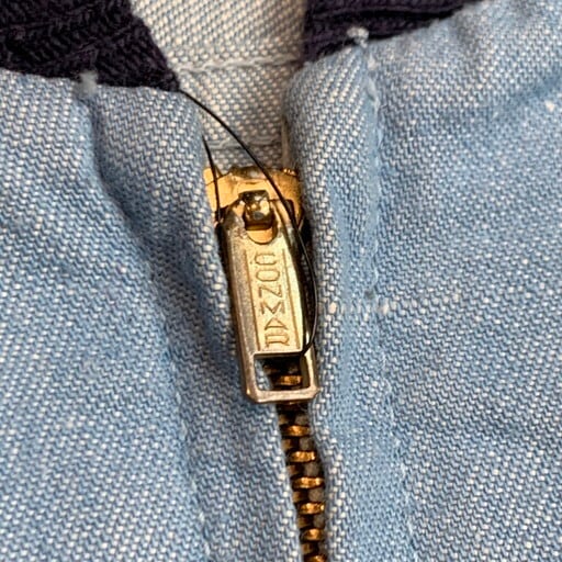 50年代頃のサックスブルーデニムブルゾンです。タグが無い為ブランド不明。ラングラーの22MWZのようなサックスブルーカラーのデニムに針抜きコットンリブのシンプルながら洗練されたデザインです。ポケットは緩いカーブを描いたステッチが表から見えるタイプです。CONMAR社のピンロックジッパーが使用されています。片爪が折れていますが開閉など使用に問題はございません。ジッパーを開けた前立て裏にはセルヴィッジが使われています。肩にうっすらとヤケの様な薄汚れがございますが、ダメージ等も無く比較的状態の良い1着です。ナス紺のようにややフェードしたリブも良いアジを出しています。サイズはM位。軽めのジャケットなので、通年使えるアイテムです。
