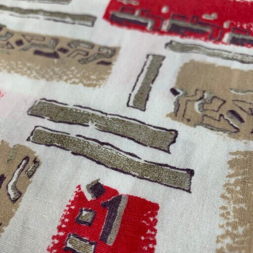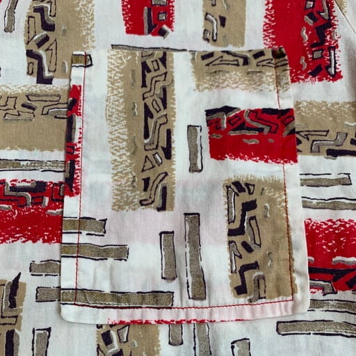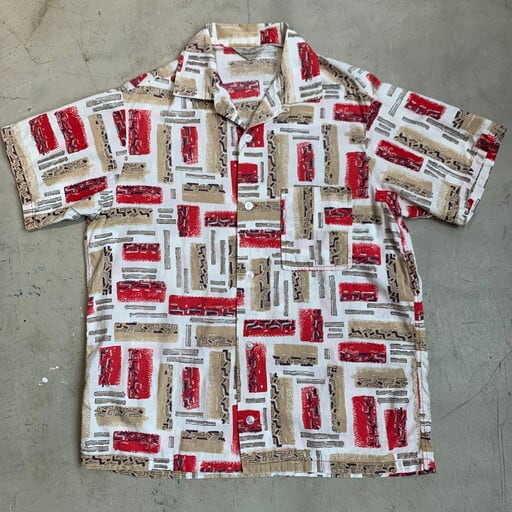 50年代から60年代頃のTOWNCRAFTコットンオープンカラーシャツです。アメリカ3大ストアと呼ばれるJCPennyが展開していたプライベートブランドです。コットン地にジオメトリックな柄がプリントされています。写真では分かり難いですが、プリントの一部は箔プリントとなっています。薄れてはいますが珍しいパターンと思います。ポケットは四角の共布が縫い付けられたパチポケタイプです。首元にうっすらと変色が見られますが、ダメージ等無く良好です。アロハとな少し違った雰囲気で合わせていただけるのではないでしょうか。サイズはMEDIUM。この夏にお勧めな1着です。