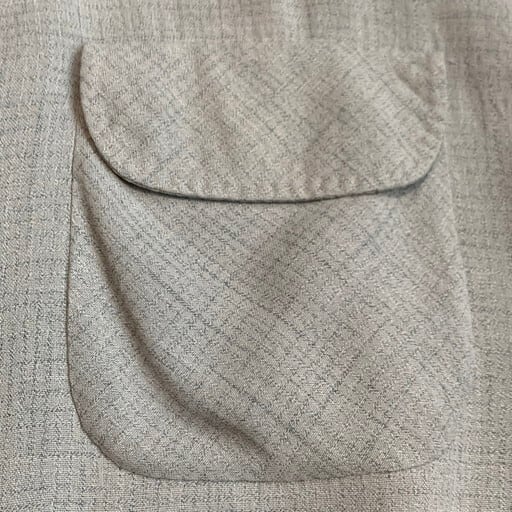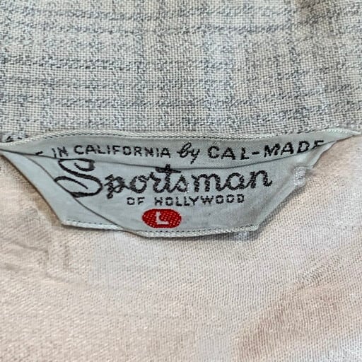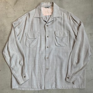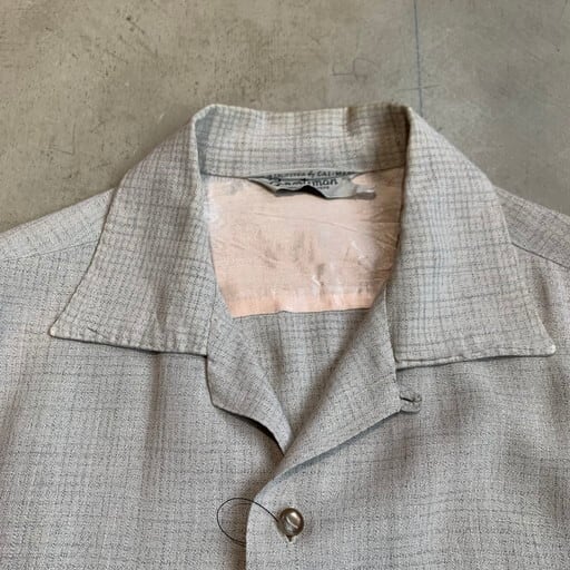 50年代頃のCAL-MADE SPORTSMAN レーヨンシャツです。カリフォルニアメイドのこちらは、グレーとベージュの境目のような淡い落ち着いたカラーで、うっすらとチェック柄になっています。生地は恐らくレーヨンと思いますが、ウールも少し入っているかもしれません。さらっとした着心地です。丸みのあるフラップポケットのこのシルエットがお好きな方も多いのではないでしょうか。首元のサテン地にやや擦れがありダグも一部ほつけています。その他ダメージ等はございませんが襟と袖口にうっすらとした汚れがございます。Lサイズですので、少しルーズなスラックス等に合わせてもかっこ良いと思います。柄もシンプルで合わせ易い1着です。