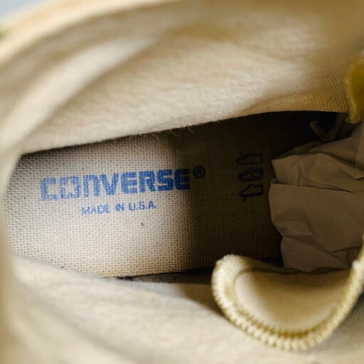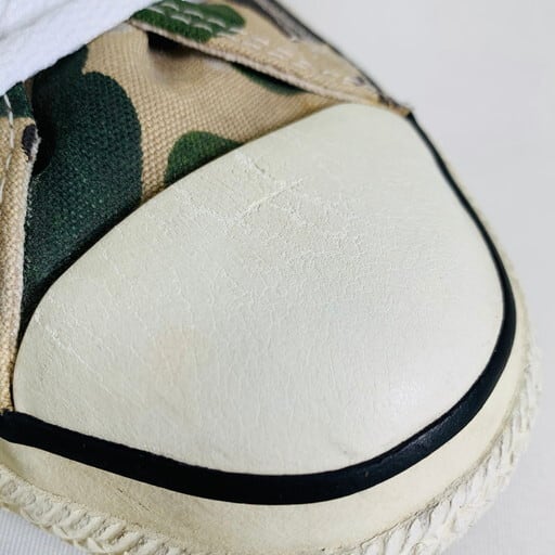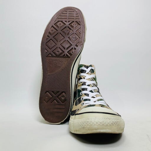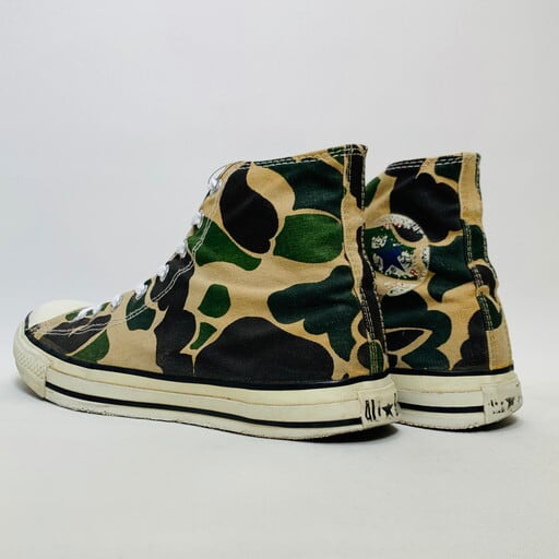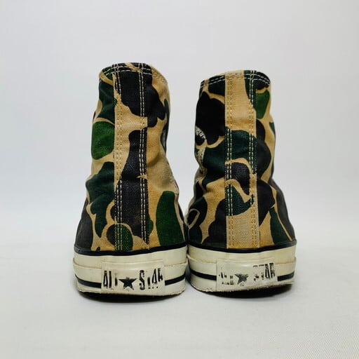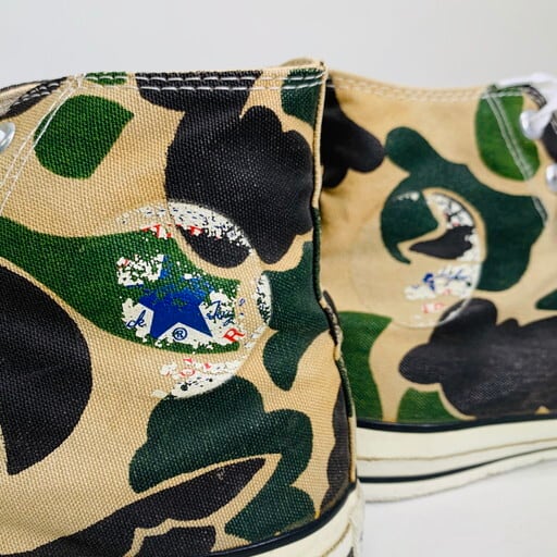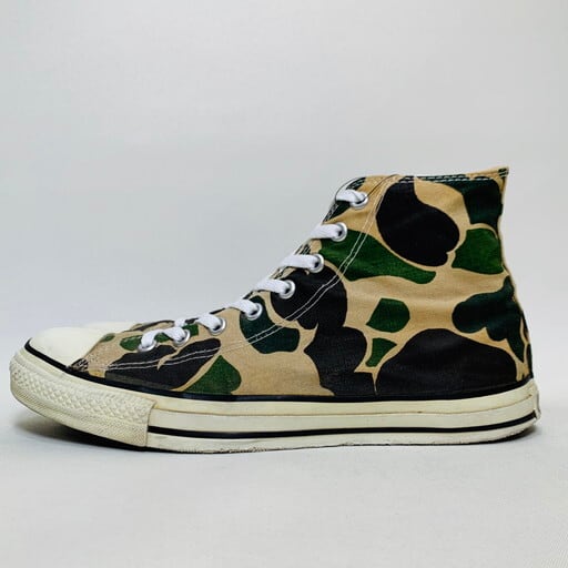 90年代後半のCONVERSEオールスターハイカモフラージュです。80年代にオールスター初の柄物として登場した迷彩柄、通称83カモの90年代復刻版です。全体に使用感が有り、アンクル部分のプリントが剥がれております。トゥキャップに若干硬化が見られますが、今のところ使用に問題はなさそうです。ソールに減りが見られます。サイズはUS10.5で、紐をぎゅっと締め上げて履くにはちょうど良い大きさです。希少なUSA製ですので、お探しだった方は必見です。