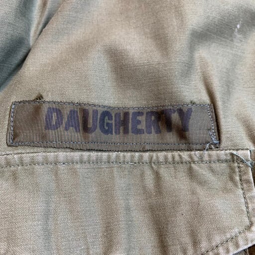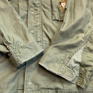 60年代頃のU.S.ARMYフィールドジャケットです。アルミジッパーが採用されたセカンドモデルとなります。コントラクト不明。首元はRAPID、フロントは無地のアルミジッパーを採用、袖口にはマチのあるモデルです。ネームパッチとワッペンが付きますがワッペンは後付けされた物だと思われます。胸ポケット等に小さなピンホールがいくつか見られます。首タグが無い為正式なサイズは不明ですが、MEDIUM REGULAR位。3rd、4thに比べ希少な2ndタイプです。M-65フィールドジャケットは流行に囚われないミリタリーの定番アイテムですので、この機会に是非手にして下さい。